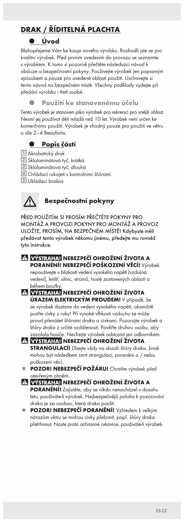 ■ POZOR! NEBEZPECI PORANENI! Vzhledem k velkym nárazüm větru se mohou civky prělomit, popr. šnúry draka prětrhnout. Noste proto ochranné rukavice, používáte-li vyrobek.