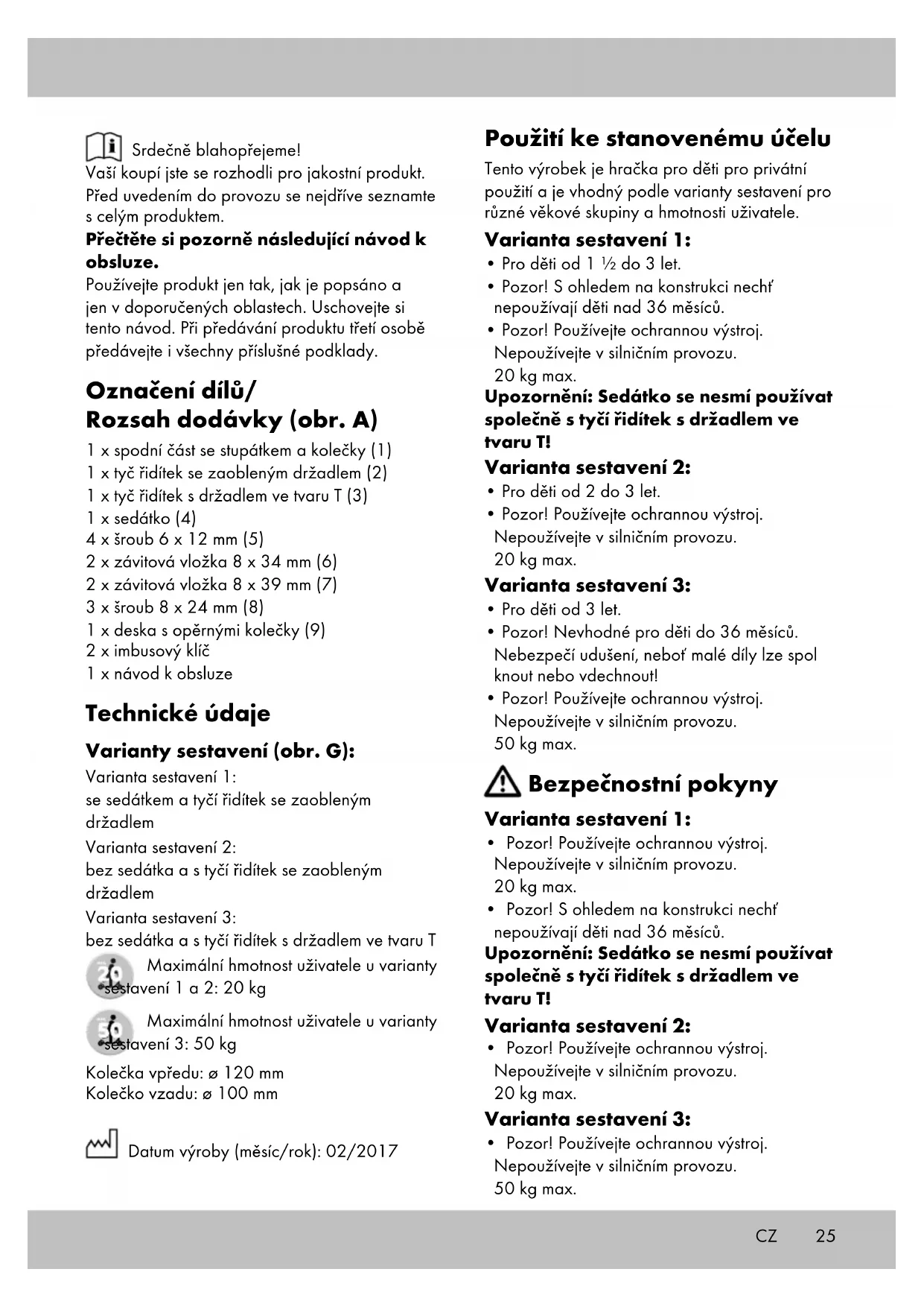 - Vyhýbejte se vodě, oleji, výtlukům a velmi hrubým povrchům. Montáž Montáž tyče řidítek (obr. B) Potřebujete spodní část (1) a pro variantu sesta- vení 1 a 2 tyč řidítek se zaobleným držadlem (2) a pro variantu sestavení 3 tyč řidítek s držadlem ve tvaru T (3). Stlačte kolíček (2a, 3a) a zastrčte tyč řidítek do spodní části (obr. B). Důležité upozornění: Dejte pozor na to, aby tyč řidítek ve spodní části zaklapla. Montáž varianty sestavení 1 (obr. C) Posaďte sedátko (4) na spodní část (1). Dejte pozor na to, aby otvory sedátka a spodní části ležely nad sebou. Zastrčte krátké závitové vložky (6) shora skrz oba přední otvory a upevněte je zdola dvěma šrouby (5). Zastrčte dlouhé závitové vložky (7) shora skrz oba zadní otvory a zadní otvory desky s opěrnými kolečky (9). Upevněte je zdola dvěma šrouby (5). Do předního otvoru desky s opěrnými kolečky zašroubujte šroub (8) a ten pevně utáhněte (obr. D). Pro montáž použijte přibalený imbusový klíč. Montáž varianty sestavení 2 (obr. E) Pomocí šroubů (8) upevněte desku s opěrnými kolečky do zadních tří otvorů a pevně šrouby utáhněte přibaleným imbusovým klíčem. Výškové přestavení sedátka (obr. F) Sedátko může být nastaveno do různých výšek od cca 26 - 32 cm. K tomu uvolněte stavěcí šroub (4a) a nastavte požadovanou výšku. Opět utáhněte stavěcí šroub. Demontáž Demontáž tyče řidítek Stlačte kolíček (2a, 3a) na zadní straně spodní části a vytáhněte ven tyč řidítek (obr. B). Demontáž sedátka Uvolněte šrouby a vytáhněte závitové vložky. Sundejte sedátko. CZ27 Používání Jízda Podle varianty sestavení se posadíte na sedátko a oběma nohama se pravidelně švihem odrážíte nebo při použití bez sedátka se jednou nohou postavíte na stupátko a pravidelně švihem se odrážíte druhou nohou. Výrobek se řídí pomocí přenášení váhy. Brzdy U varianty sestavení se sedátkem se brzdí spuštěním obou nohou na zem. Při použití bez sedátka se k brzdění šlape jednou nohou na třecí brzdu zadního kolečka. Údržba Výměna předních koleček Přední kolečka můžete vyměnit. Důležité upozornění! Respektujte technické údaje. Kolečka s jiným průměrem mohou změnit jízdní vlastnosti a za určitých okolností vést k ohrožení uživatele. Nepoužívejte kolečka, která se nedají dokonale zamontovat. Nikdy nemontujte větší kolečka, než byla původní kolečka výrobku. Kolečka se opotřebovávají. Toto opotřebení závisí na mnoha faktorech, jako např. na podk- ladu, velikosti a váze uživatele, povětrnostních podmínkách, materiálu koleček a jejich tvrdosti. Proto je nutné, je čas od času vyměnit.