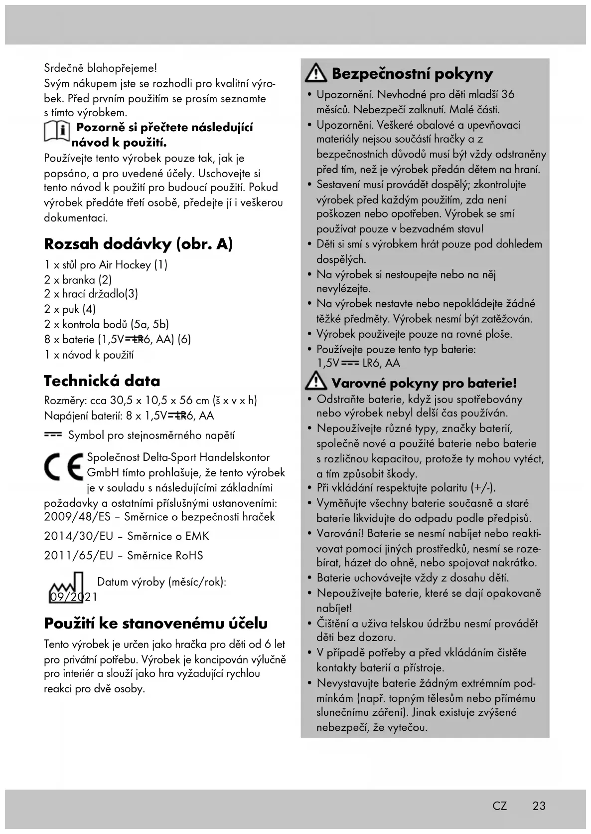 Nároky z této záruky jsou vyloučeny, pokud výro- bek byl používán neodborně nebo nedovoleným způsobem nebo nikoli v rámci stanoveného účelu určení nebo předpokládaného rozsahu používání nebo nebyla dodržena zadání v návodu k obsluze, ledaže by koncový zákazník prokázal, že existuje vada materiálu nebo došlo k chybě ve zpraco- vání, které nevyplývají z některé výše uvedených okolností. Nároky ze záruky lze uplatnit pouze v rámci záruční lhůty po předložení originálního poklad- ního dokladu. Proto si prosím uschovejte originál pokladního dokladu. Doba záruky se neprodlužuje případnými opravami na základě záruky, zá- konné záruky nebo kulance. Totéž platí také pro vyměněné a opravené díly. Při reklamacích se prosím obracejte na níže uve- denou horkou linku servisu nebo se s námi spojte e-mailem. Pokud se vyskytne případ reklamace, výrobek Vám – dle naší volby – bezplatně opraví- me, vyměníme nebo Vám vrátíme kupní cenu. Další práva ze záruky nevznikají. Vaše zákonná práva, zejména nároky na zajištění záruky vůči konkrétnímu prodejci, nejsou touto zárukou omezena. IAN: 366552_2101 Servis Česko Tel.: 800143873 E-Mail: deltasport@lidl.cz26 Blahoželáme! Svojím nákupom ste sa rozhodli pre kvalitný výrobok. Pred prvým použitím sa s výrobkom dôkladne oboznámte. Pozorne si prečítajte tento návod na použivanie. Výrobok používajte len uvedeným spôsobom a na uvedený účel. Tento návod na použivanie si dobre uschovajte. Pri odovzdávaní výrobku tretej osobe odovzdajte s výrobkom aj všetky podklady. Obsah balenia (obr. A) 1 x stôl pre vzdušný hokej (1) 2 x bránka (2) 2 x hokejka (3) 2 x puk (4) 2 x regulátor bodov (5a, 5b) 8 x batéria (1,5V LR6, AA) (6) 1 x návod na použivanie Technické údaje Rozmery: cca 30,5 x 10,5 x 56 cm (Š x V x H) Zásobovanie energiou batérie: 8 x 1,5V LR6, AA Symbol pre jednosmerné napätie Spoločnosť Delta-Sport Handelskontor GmbH týmto vyhlasuje, že tento výrobok je v súlade s nasledujúcimi základnými požiadavkami a ostatnými príslušnými ustanoveniami: 2009/48/ES – Smernica o bezpečnosti hračiek 2014/30/EU – Smernica o elektromagnetickej Kompatibilite 2011/65/EÚ – Smernica RoHS Dátum výroby (mesiac/rok): 09/2021 Použitie podľa určenia Tento výrobok je hračka pre deti od 6 rokov pre súkromné použitie. Tento výrobok je určený výhradne pre použitie v interiéri a slúži ako hra reflexov pre dve osoby. Bezpečnostné pokyny