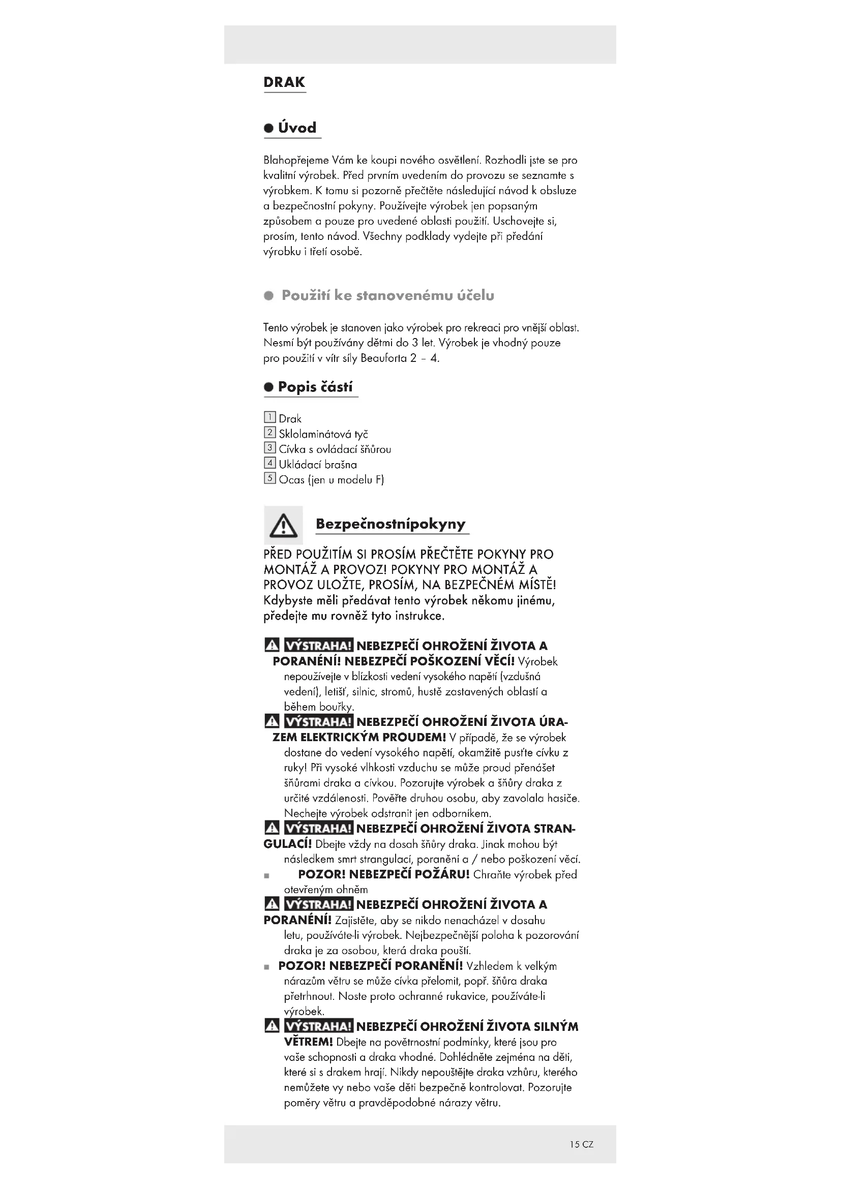 VĚTREM! Dbejte na povětrnostní podmínky, které jsou pro vaše schopnosti a draka vhodné. Dohlédněte zejména na děti, které si s drakem hrají. Nikdy nepouštějte draka vzhůru, kterého nemůžete vy nebo vaše děti bezpečně kontrolovat. Pozorujte poměry větru a pravděpodobné nárazy větru.16 CZ Děti musí být kdykoli pod pohledem dospělých, hrají-li se s výrobkem. Výrobek nepoužívejte při následujících povětrnostních podmínkách: déšť, větrná bouře, bouřka. Před použitím výrobku se informujte prostřednictvím aktuální předpovědi počasí. Šňůra draka je dimenzována pro hmotnost v tahu max. 18 kg. Nepřipevněte k ní žádné přídavné draky. Výrobek používejte jen na místech, na nichž je použití draků povoleno. Mějte na paměti, že tomu tak není např. na všech plážích. Před použitím výrobku se informujte u příslušné správy obce nebo města. Před každým použitím přezkoušejte, jsou-li všechna spojení a šňůra draka v pořádku. Montáž Smontujte výrobek podle Ill. B a C. Obsluha Síla větru 0 Bft (Bezvětří) Kouř stoupá svisle, žádný pohyb ve vzduchu Draci budou létat pouze s podporou 1 Bft (Vánek) Kouř uniká pryč Vhodné pro velmi lehké draky 2 Bft (Větřík) Listy šustí, vítr citelný na kůži Dobré pro profesionály 3 Bft (Slabý vítr) Listy a malé větvičky se pohybují Dobrý vítr pro začátečníky 4 Bft (Mírný vítr) Pohybují se malé větve, vlajky vlají Dobré pro středně velké draky 5 Bft (Čerstvý vítr) Velké větve a malé stromy se kývají Velcí draci mohou utrpět poškození 6 Bft (Silný vítr) Velké větve se hýbají, vítr hvízdá Mez pro všechny tuhé draky 7 Bft (Mírný vichr) Celé stromy v pohybu Vhodné pouze pro tažné draky a profesionály Start Dvě osoby (začátečníci): Postavte se zády proti větru a držte pevně cívku. Váš partner drží pevně draka a vzdálí se od vás po větru cca. 20 m. Odviňte přitom šňůru draka z cívky. Držte šňůru draka, aby byla napnutá. Řekněte svému partnerovi, kdy může draka uvolnit. Musí se pak okamžitě vzdálit z dosahu draka a šňůry draka. Pohybujte se zpátky proti větru. Drak by se měl nyní vznést. Jedna osoba (pokročilá): Odviňte cca. 2 m šňůry draka a položte od vás cca. 2 m vzdáleného draka horní stranou nahoru na zem. Držte pevně cívku. Pak zatáhněte trhavě a silně s cívkou na draku. Drak by se měl nyní vznést.17 CZ Přistání Přesvědčte se, že je dost místa k přistání, aby se jiné osoby nemohly poranit. Řiďte draka z větru a uvolněte rychle šňůru draka odvinutím. Postavte se příčně proti větru. Nechejte držet draka duhou osobou, zatímco navíjíte šňůru draka na cívku, aby se drak nemohl omylem znovu vznést do vzduchu. Čištění a ošetřování Odstraňte špínu z výrobku vlhkým hadříkem a mýdlovou vodou. Nepoužívejte agresivní čisticí prostředky. Výrobek uskladněte v suchém prostředí chráněném před světlem. Odstranění do odpadu Obal se skládá z ekologicky vhodných materiálů, které můžete jednoduše zlikvidovat prostřednictvím místních recyklačních středisek. Informujte se o možnostech odstranění použitého výrobku do odpadu u Vaší místní obecní nebo městské správy.18