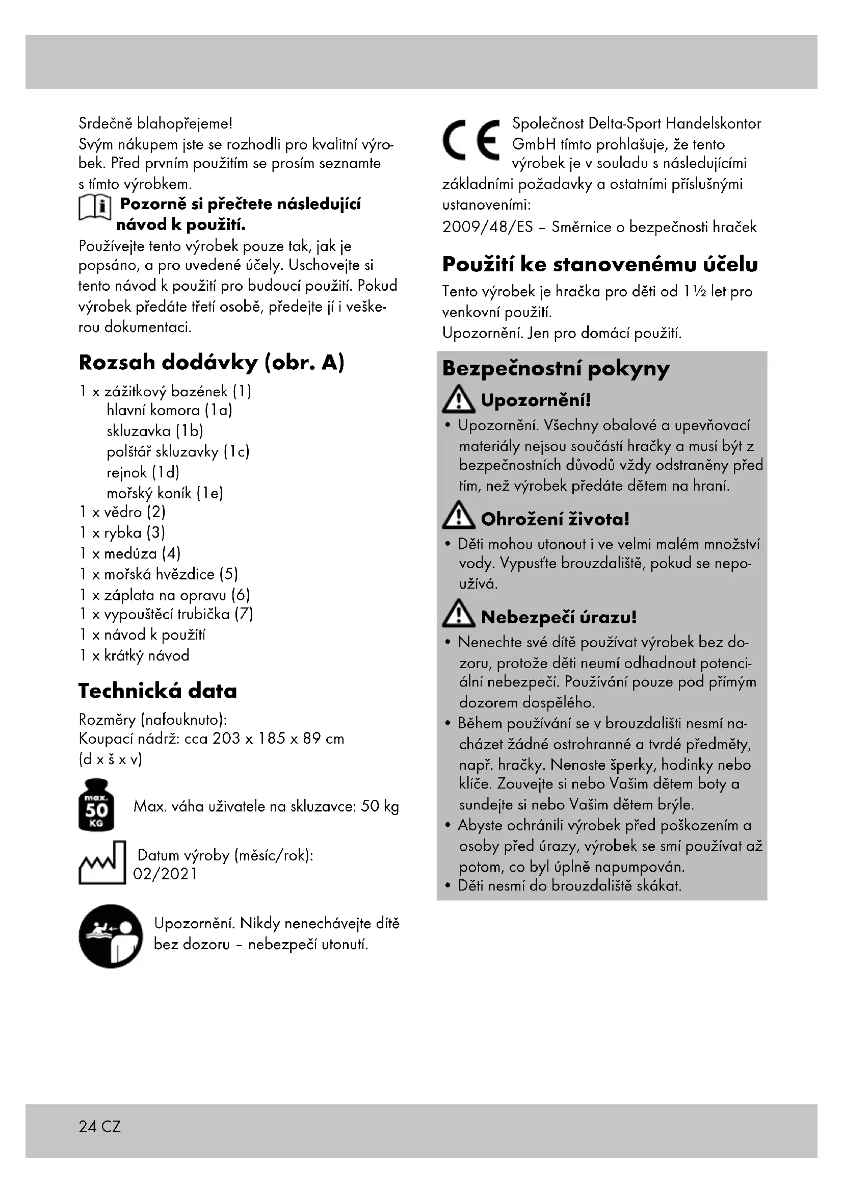 Pokyny k záruce a průběhu služby Produkt byl vyrobený s velkou pečlivostí a byl průběžně kontrolovaný ve výrobní procesu. Na tento produkt obdržíte tříroční záruku ode dne zakoupení. Uschovejte si pokladní stvrzenku. Záruka se vztahuje jen na vady materiálu a chyby z výroby, nevztahuje se na závady způsobené neodborným zacházením nebo použitím k jinému účelu. Tato záruka neomezuje Vaše zákonná ani záruční práva. Při případných reklamacích se obraťte na dole uvedenou servis- ní horkou linku nebo nám zašlete email. Náš servisní pracovník s Vámi co nejrychleji upřesní další postup. V každém případě Vám osobně poradíme. Záruční doba se neprodlužuje po pří- padných opravách v době záruky ani v případě zákonného ručení nebo kulance. Toto platí také pro náhradní a opravené díly. Opravy prováděné po vypršení záruční lhůty se platí. IAN: 351982_2007 Servis Česko Tel.: 800143873 E-Mail: deltasport@lidl.cz28 Blahoželáme! Svojím nákupom ste sa rozhodli pre kvalitný výrobok. Pred prvým použitím sa s výrobkom dôkladne oboznámte. Pozorne si prečítajte tento návod na použivanie. Výrobok používajte len uvedeným spôsobom a na uvedený účel. Tento návod na použivanie si dobre uschovajte. Pri odovzdávaní výrobku tretej osobe odovzdajte s výrobkom aj všetky podklady. Obsah balenia (obr. A) 1 x zážitkový bazén (1) hlavná komora (1a) kĺzačka (1b) calúnenie kĺzačky (1c) raja (1d) morský koník (1e) 1 x vedro (2) 1 x ryba (3) 1 x medúza (4) 1 x morská hviezdica (5) 1 x záplata na opravu (6) 1 x odvzdušňovacia rúrka (7) 1 x návod na používanie 1 x krátky návod Technické údaje Rozmery naplnený vzduchom: Bazén: cca 203 x 185 x 89 cm (d x š x v) Max. hmotnosť používateľa kĺzačka: 50 kg Dátum výroby (mesiac/rok): 02/2021 Upozornenie. Nikdy nenechajte vaše dieťa bez dohľadu - nebezpečenstvo utopenia. Spoločnosť Delta-Sport Handelskon- tor GmbH týmto vyhlasuje, že tento výrobok je v súlade s nasledujúcimi základnými požiadavkami a ostatnými príslušnými ustanoveniami: 2009/48/ES – Smernica o bezpečnosti hračiek Používanie podľa určenia Tento výrobok je hračka pre deti od 1½ rokov pre použitie v exteriéri. Upozornenie. Iba na domáce použitie. Bezpečnostné pokyny Upozornenie!