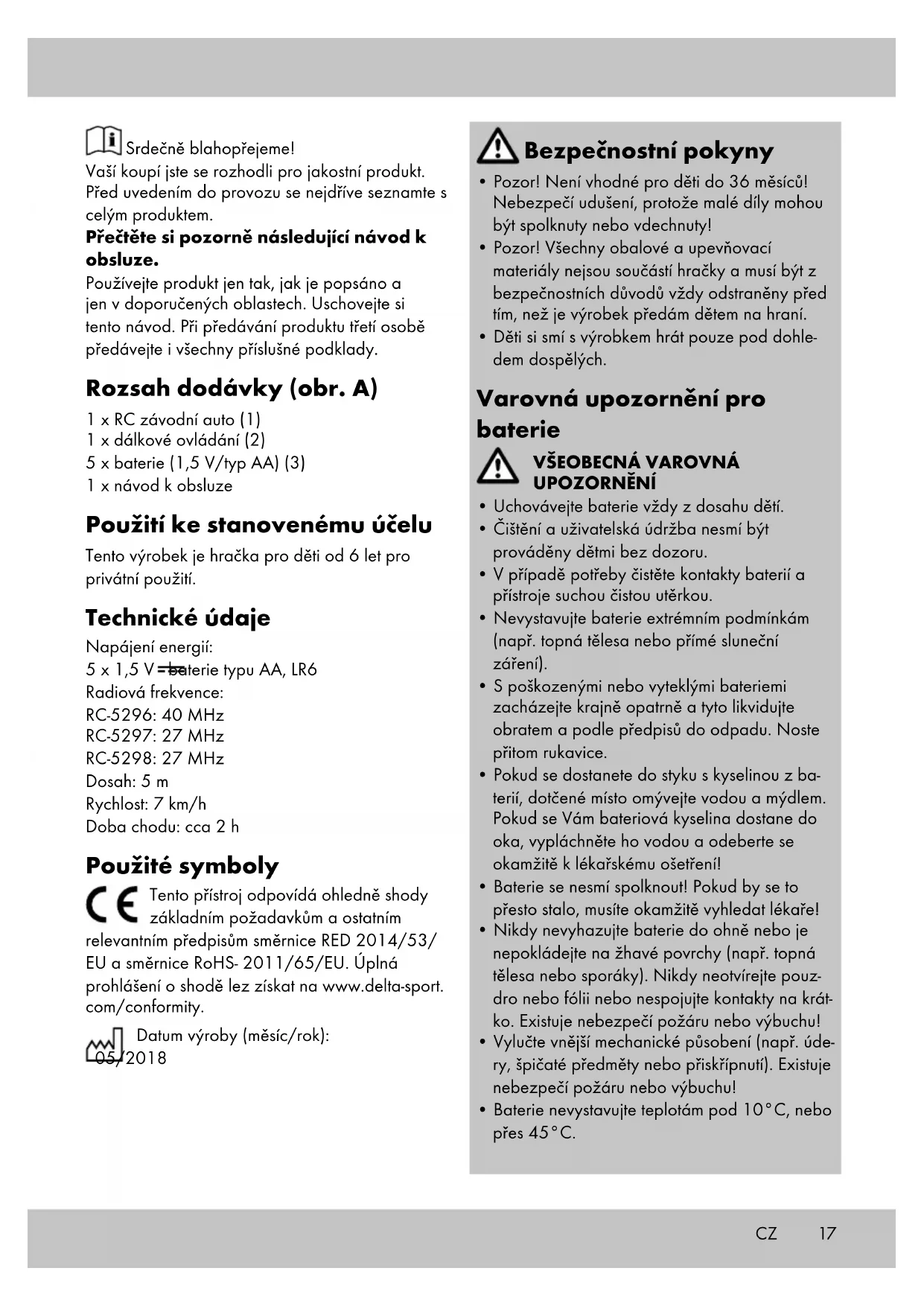 nadále nejede rovně. Skladování, čištění Výrobek skladujte vždy suchý a čistý v temperova- ném prostoru. Čistit pouze vodou a návazně utírat do sucha čisticím hadříkem. DŮLEŽITÉ UPOZORNĚNÍ! Nikdy nečistěte agre- sivními čisticími prostředky. Pokyny k likvidaci Výrobek a obalový materiál likvidujte do odpadu podle aktuálních místních předpisů. Obalový materiál, jako např. fóliové sáčky, nepatří do dětských rukou. Obalový materiál uchovávejte z dosahu dětí. Přístroje označené vedle stojícím symbolem, nesmí být likvidovány s domácím odpadem. Vaší povinností je takové staré elektrické a elektronické přístroje likvidovat zvlášť. Informujte se prosím na Vaší obci o možnostech řádné likvidace odpadu. Před likvidací do odpadu odstraňte z výrobku baterie. Likvidace baterií Respektujte prosím: že v případě baterií se jedná o zvláštní odpad, který se podle zákona nesmí likvidovat s domovním odpadem. Vysloužilé baterie můžete bezplatně odevzdat na sběrných místech komunálního odpadu nebo u obchodníka. Jsou zde k dispozici sběrné nádoby. Pokyny k záruce a průběhu služby Produkt byl vyrobený s velkou pečlivostí a byl průběžně kontrolovaný ve výrobní procesu. Na tento produkt obdržíte tříroční záruku ode dne zakoupení. Uschovejte si pokladní stvrzenku. Záruka se vztahuje jen na vady materiálu a chyby z výroby, nevztahuje se na závady způsobené neodborným zacházením nebo použitím k jinému účelu. Tato záruka neomezuje Vaše zákonná ani záruční práva. Při případných reklamacích se obraťte na dole uvedenou servisní horkou linku nebo nám zašlete email. Náš servisní pracovník s Vámi co nejrychle- ji upřesní další postup. V každém případě Vám osobně poradíme. Záruční doba se neprodlužuje po případných opravách v době záruky ani v případě zákon- ného ručení nebo kulance. Toto platí také pro náhradní a opravené díly. Opravy prováděné po vypršení záruční lhůty se platí. IAN: 302451 Servis Česko Tel.: 800143873 E-Mail: deltasport@lidl.cz20 ¡Enhorabuena! Con la compra de este artículo ha adquirido un producto de excelente calidad. Antes de utilizarlo por primera vez, fami- liarícese con él leyendo atentamente las siguientes instrucciones de uso. Utilice el producto según lo indicado aquí y solo para los ámbitos de uso descritos. Conserve estas instrucciones de uso para futuras consultas y, en el caso de que en algún momento entregara el producto a terceros, no se olvide de adjuntar también las presentes instrucciones. Contenido del suministro (fig. A) 1 coche de carreras RC (1) 1 mando a distancia (2) 5 pilas (1,5 V/tipo AA) (3) 1 instrucciones de uso Uso conforme a lo previsto Este artículo es un juguete de uso doméstico para niños a partir de 6 años. Datos técnicos Alimentación de energía: 5 pilas tipo AA LR6 de 1,5 V Radiofrecuencia: RC-5296: 40 MHz RC-5297: 27 MHz RC-5298: 27 MHz Alcance: 5 m Velocidad: 7 km/h Duración: aprox. 2 h Símbolos empleados Este dispositivo cumple en lo relativo a la conformidad con los requisitos básicos y otras disposiciones relevantes de las directivas RED 2014/53/UE y RoHS 2011/65/UE. Las declaraciones de conformidad completas pueden encontrarse en www.delta-sport.com/ conformity. Fecha de fabricación (mes/año): 05/2018 Indicaciones de seguridad
