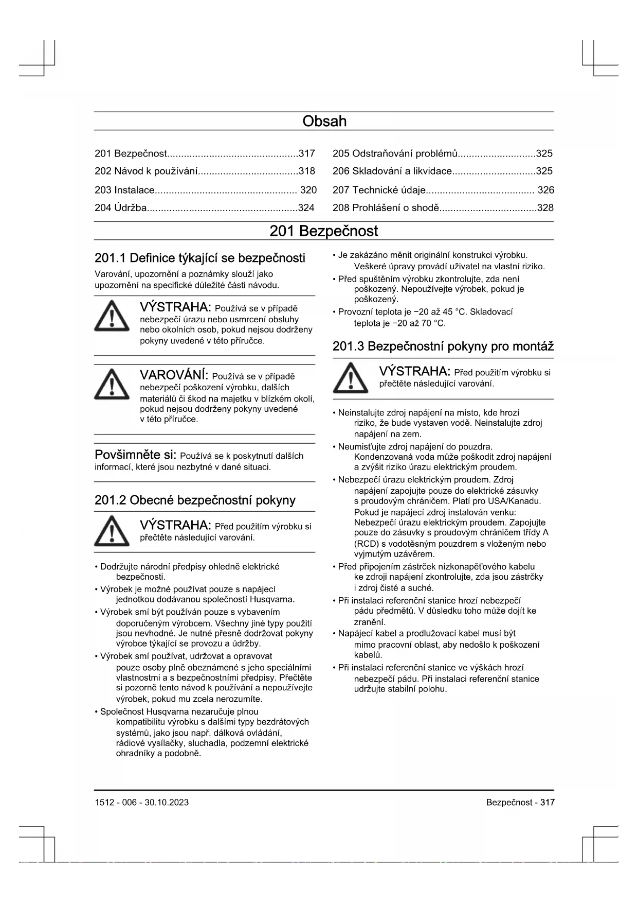VÝSTRAHA: Než začnete instalovat výrobek, přečtěte si pozorně kapitolu obezpečnosti. VAROVÁNÍ: Používejte originální náhradní díly ainstalační materiál. Povšimněte si: Další informace oinstalaci naleznete včásti www.husqvarna.com.