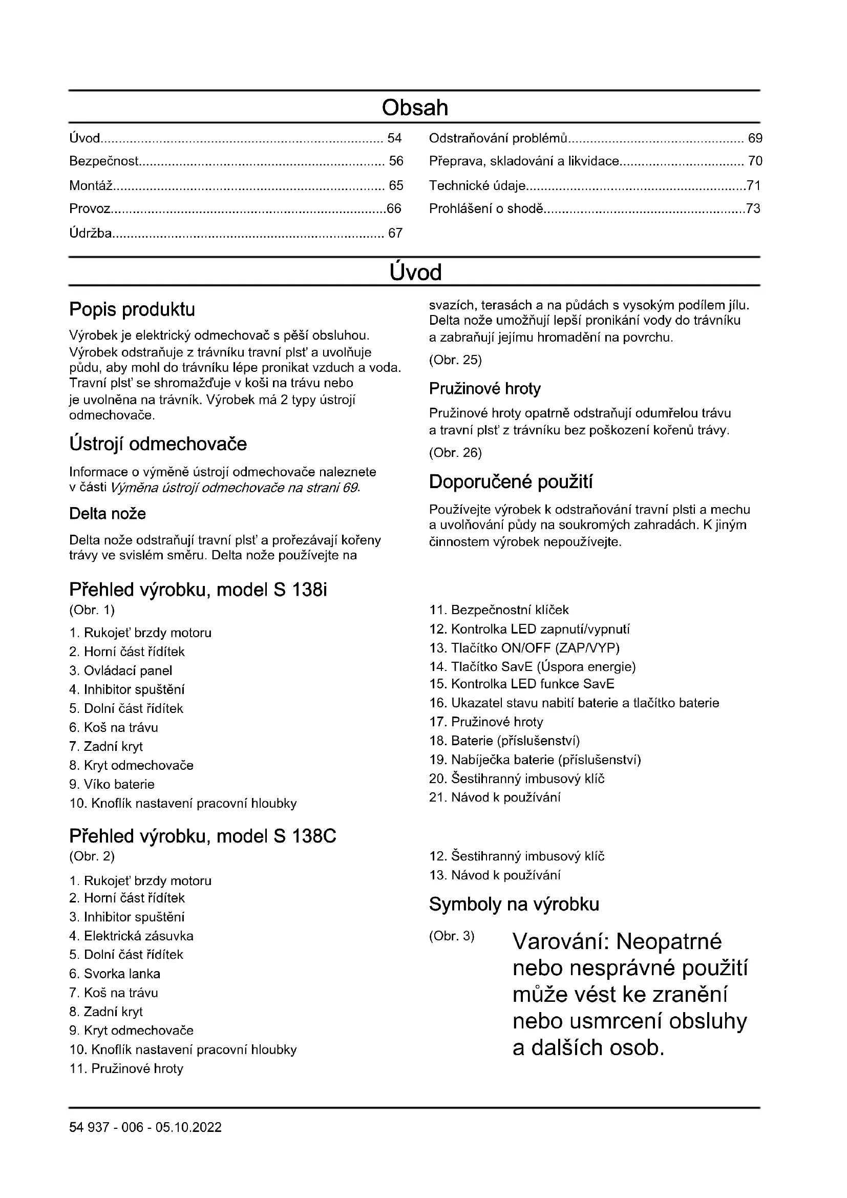 Symboly na výrobku (Obr. 3) Varování: Neopatrné nebo nesprávné použití může vést ke zranění nebo usmrcení obsluhy adalších osob. 54 937 - 006 - 05.10.2022(Obr. 4) Přečtěte si návod kpoužívání anepoužívejte stroj, pokud mu zcela nerozumíte. (Obr. 5) Pozor na odvržené aodražené předměty. (Obr. 6) Zajistěte, aby se vpracovní oblasti ajejím okolí nezdržovaly nepovolané osoby či zvířata. (Obr. 7) Varování: Ruce anohy udržujte mimo dosah rotujícího nože. (Obr. 8) Před prováděním údržby výrobku vyjměte bezpečnostní klíček (model S 138i). (Obr. 9) Před prováděním údržby výrobku jej odpojte od elektrické sítě (model S 138C). (Obr. 10) Nebezpečí úrazu elektrickým proudem (model S 138C). (Obr. 11) Nevystavujte dešti (model S 138i). (Obr. 12) Varování: Dávejte pozor, abyste nepřejeli přes kabel napájení anepřesekli jej. Může to způsobit úraz elektrickým proudem nebo poškození výrobku (model S 138C). (Obr. 13) Tento výrobek má ochranu proti stříkající vodě. (Obr. 14) Tento výrobek odpovídá příslušným směrnicím EAC. (Obr. 15) Tento výrobek vyhovuje příslušným směrnicím ES. (Obr. 16) Tento výrobek vyhovuje platným předpisům Spojeného království. (Obr. 17) Výrobek odpovídá příslušným směrnicím UkrSEPRO. (Obr. 18) Štítek semisemi hluku do okolí podle směrnic apředpisů Evropské unie aSpojeného království anařízení oregulaci hluku vaustralském Novém Jižním Walesu „Protection of the Environment Operations (Noise Control) Regulation 2017“. Garantovaná hladina