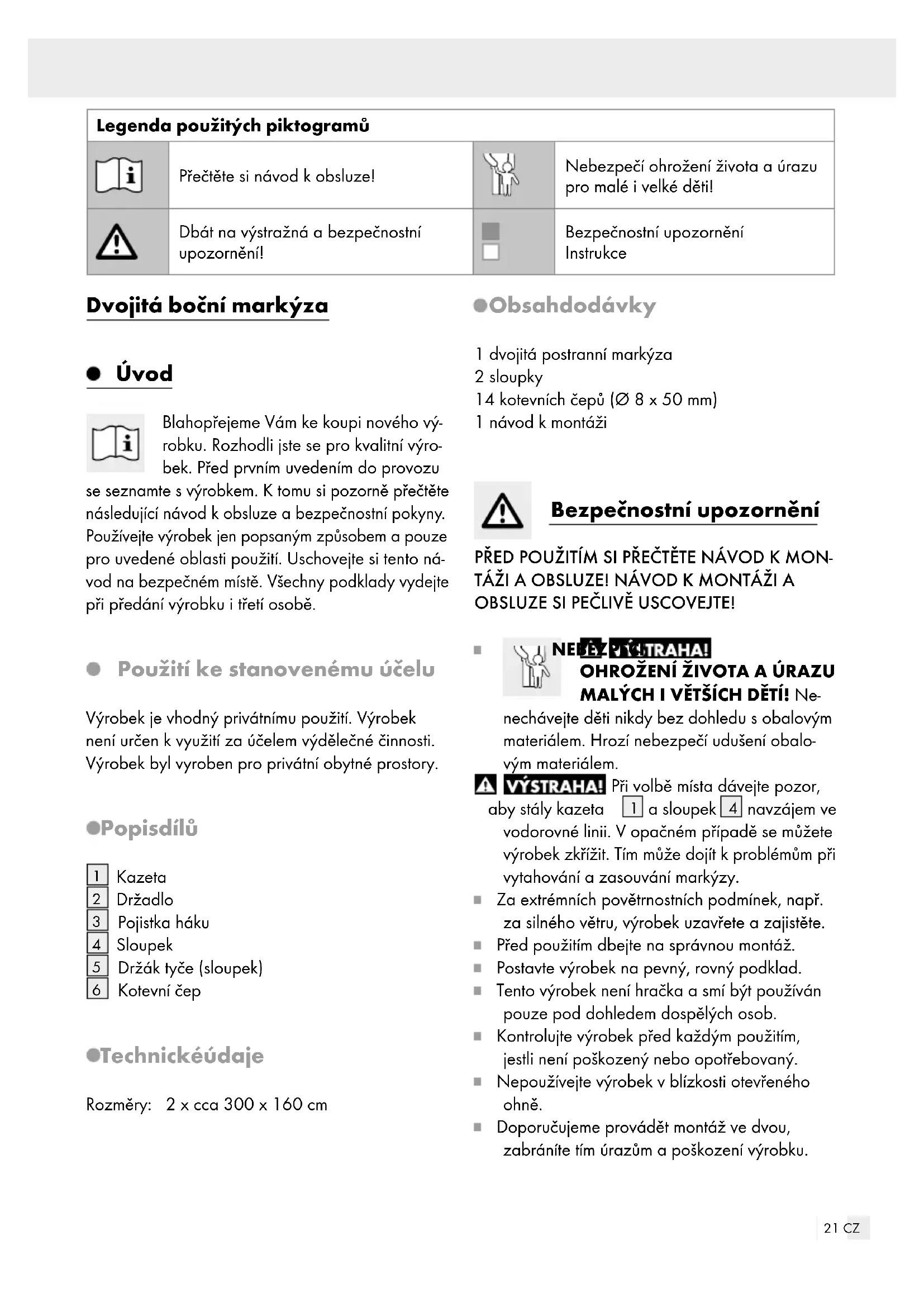 Kotevní čep Technické údaje Rozměry: 2 x cca 300 x 160 cm Obsah dodávky 1 dvojitá postranní markýza sloupky 14 kotevních čepů (Ø 8 x 50 mm) 1 návod k montáži Bezpečnostní upozornění PŘED POUŽITÍM SI PŘEČTĚTE NÁVOD K MON- TÁŽI A OBSLUZE! NÁVOD K MONTÁŽI A OBSLUZE SI PEČLIVĚ USCOVEJTE! NEBEZPEČÍ