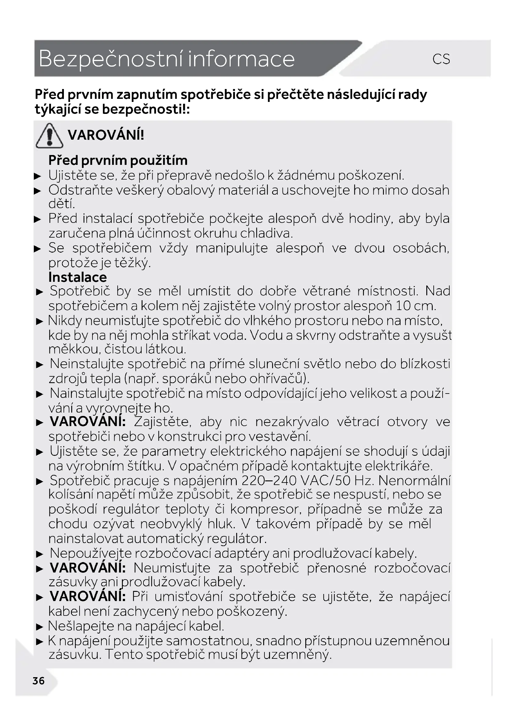 VAROVÁNÍ! Před prvním použitím ► Ujistěte se, že při přepravě nedošlo k žádnému poškození. ► Odstraňte veškerý obalový materiál a uschovejte ho mimo dosah dětí. ► Před instalací spotřebiče počkejte alespoň dvě hodiny, aby byla zaručena plná účinnost okruhu chladiva. ► Se spotřebičem vždy manipulujte alespoň ve dvou osobách, protože je těžký. Instalace ► Spotřebič by se měl umístit do dobře větrané místnosti. Nad spotřebičem a kolem něj zajistěte volný prostor alespoň 10 cm. ► Nikdy neumisťujte spotřebič do vlhkého prostoru nebo na místo, kde by na něj mohla stříkat voda. Vodu a skvrny odstraňte a vysušte měkkou, čistou látkou. ► Neinstalujte spotřebič na přímé sluneční světlo nebo do blízkosti zdrojů tepla (např. sporáků nebo ohřívačů). ► Nainstalujte spotřebič na místo odpovídající jeho velikost a použí- vání a vyrovnejte ho. ► VAROVÁNÍ: Zajistěte, aby nic nezakrývalo větrací otvory ve spotřebiči nebo v konstrukci pro vestavění. ► Ujistěte se, že parametry elektrického napájení se shodují s údaji na výrobním štítku. V opačném případě kontaktujte elektrikáře. ► Spotřebič pracuje s napájením 220–240 VAC/50 Hz. Nenormální kolísání napětí může způsobit, že spotřebič se nespustí, nebo se poškodí regulátor teploty či kompresor, případně se může za chodu ozývat neobvyklý hluk. V takovém případě by se měl nainstalovat automatický regulátor. ► Nepoužívejte rozbočovací adaptéry ani prodlužovací kabely. ► VAROVÁNÍ: Neumisťujte za spotřebič přenosné rozbočovací zásuvky ani prodlužovací kabely. ► VAROVÁNÍ: Při umisťování spotřebiče se ujistěte, že napájecí kabel není zachycený nebo poškozený. ► Nešlapejte na napájecí kabel. ► K napájení použijte samostatnou, snadno přístupnou uzemněnou zásuvku. Tento spotřebič musí být uzemněný.CS Bezpečnostní informace