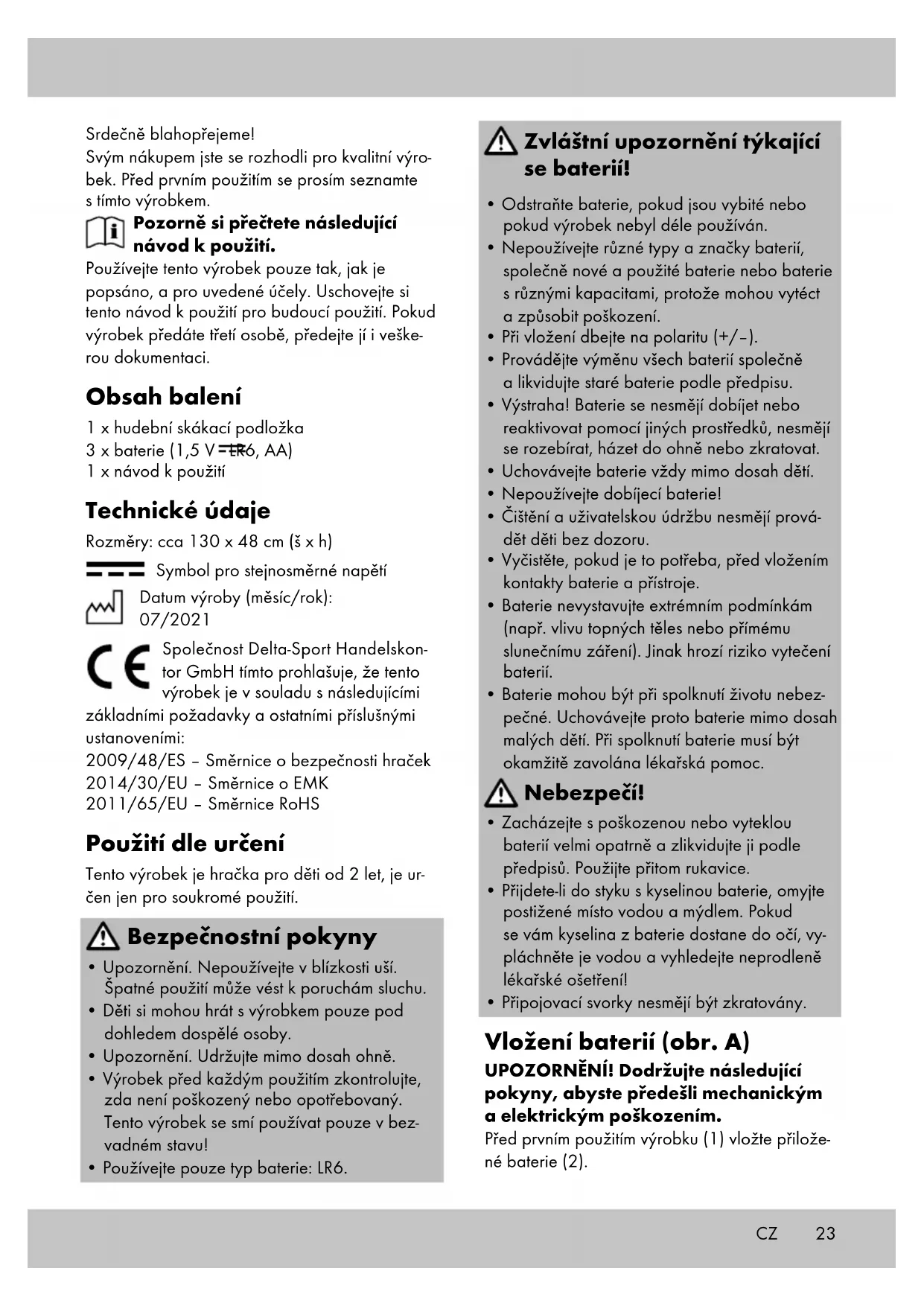 - Během přehrávky stiskněte jiný nástroj, kterým se záznam má přehrát. CZ25CZ Uskladnění, čištění Pokud výrobek nepoužíváte, skladujte jej vždy suchý, čistý, bez baterií a při pokojové teplotě. Čistěte pouze vlhkým hadříkem a následně otřete do sucha. DŮLEŽITÉ! K čištění nikdy nepoužívejte agresivní čisticí prostředky. Pokyny k likvidaci V zájmu ochrany životního prostředí nevyhazujte svůj výrobek do odpadu v případě, že dosloužil, ale odneste jej na profesionální místo k likvidaci. O sběrných místech a jejich otevírací době se můžete informovat u příslušné místní správy. Vadné nebo použité baterie/akumulátory musejí být recyklovány v souladu se směrnicí 2006/66/ES a jejími změnami. Odevzdejte baterie/akumulátory a/nebo výrobek prostřed- nictvím nabízených sběrných zařízení. Balicí materiály jako např. fóliové pytle nepatří do rukou dětí. Uchovávejte balicí materiál mimo dosah dětí. Poškození životního prostředí v důsledku nesprávné likvidace baterií/akumuláto- rů! Baterie/akumulátory nesmějí být likvidovány spolu s komunálním odpadem. Mohou obsahovat toxické těžké kovy a podléhají zpracování nebezpečného odpadu. Chemické symboly těžkých kovů jsou následující: Cd = kadmium, Hg = rtuť, Pb = olovo. Použité baterie/akumulátory proto likvidujte v místním sběrném místě. Výrobek a obal zlikvidujte ekologicky. Při třídění odpadu dodržujte označení balicích materiálů, které jsou označeny zkratkami (a) a čísly (b) s následujícím významem: 1–7: plasty/20–22: papír a karton/80–98: smíšený odpad. Výrobek a balicí materiály jsou recyklovatelné, likvidujte je odděleně pro lepší zpracování odpadu. Logo Triman platí pouze pro Francii. Možnosti likvidace výrobku, který dosloužil, jsou k dispozici u místní nebo městské správy. Pokyny k záruce a průběhu služby Výrobek byl vyroben s velkou péčí a za stálé kontroly. DELTA-SPORT HANDELSKONTOR GmbH poskytuje koncovým privátním zákaz- níkům na tento výrobek tři roky záruky od data nákupu (záruční lhůta) podle následující ustanovení. Záruka se týká pouze vad materiálu a závad ve zpracování. Záruka se nevztahuje na díly, které podléhají normálnímu opotřebení, a proto je nutné na ně pohlížet jako na rychle opotřebitelné díly (např. baterie), a na křehké díly, např. vypínače, akumulátory nebo díly vyrobené ze skla. Nároky z této záruky jsou vyloučeny, pokud vý- robek byl používán neodborně nebo nedovole- ným způsobem nebo nikoli v rámci stanoveného účelu určení nebo předpokládaného rozsahu používání nebo nebyla dodržena zadání v návodu k obsluze, ledaže by koncový zákazník prokázal, že existuje vada materiálu nebo došlo k chybě ve zpracování, které nevyplývají z některé výše uvedených okolností. Nároky ze záruky lze uplatnit pouze v rámci záruční lhůty po předložení originálního poklad- ního dokladu. Proto si prosím uschovejte originál pokladního dokladu. Doba záruky se neprodlu- žuje případnými opravami na základě záruky, zákonné záruky nebo kulance. Totéž platí také pro vyměněné a opravené díly. Při reklamacích se prosím obracejte na níže uve- denou horkou linku servisu nebo se s námi spojte e-mailem. Pokud se vyskytne případ reklamace, výrobek Vám – dle naší volby – bezplatně opra- víme, vyměníme nebo Vám vrátíme kupní cenu. Další práva ze záruky nevznikají. Vaše zákonná práva, zejména nároky na zajiště- ní záruky vůči konkrétnímu prodejci, nejsou touto zárukou omezena. IAN: 366944_2101 Servis Česko Tel.: 800143873 E-Mail: deltasport@lidl.cz26 Blahoželáme! Svojím nákupom ste sa rozhodli pre kvalitný výrobok. Pred prvým použitím sa s výrobkom dôkladne oboznámte. Pozorne si prečítajte tento návod na použivanie. Výrobok používajte len uvedeným spôsobom a na uvedený účel. Tento návod na použivanie si dobre uschovajte. Pri odovzdávaní výrobku tretej osobe odovzdajte s výrobkom aj všetky podklady. Rozsah dodávky 1 x hudobná podložka 3 x batéria (1,5 V LR6, AA) 1 x návod na používanie Technické údaje Rozmery: cca 130 x 48 cm (Š x H) Symbol pre jednosmerné napätie Dátum výroby (mesiac/rok): 07/2021 Spoločnosť Delta-Sport Handelskon- tor GmbH týmto vyhlasuje, že tento výrobok je v súlade s nasledujúcimi základnými požiadavkami a ostatnými príslušnými ustanoveniami: 2009/48/ES – Smernica o bezpečnosti hračiek 2014/30/EÚ – Smernica o elektromagnetickej kompatibilite 2011/65/EÚ – Smernica RoHS Určené použitie Tento výrobok je hračka pre deti od 2 rokov určený na súkromné použitie. Bezpečnostné pokyny