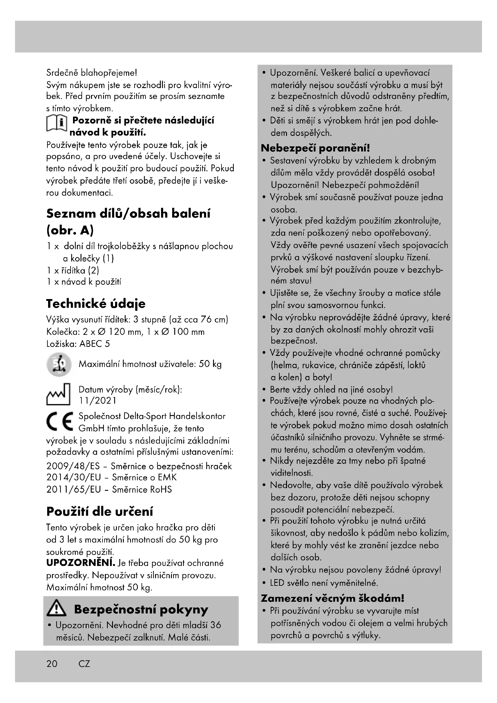 Po výměně: Ujistěte se, že jsou šrouby po prvních minutách jízdy ještě utažené a že se ne- uvolnily nebo nepovolily. Kolečko ještě jednou utáhněte, abyste zajistili, že poběží klidně. Uskladnění, čištění Po použití doporučujeme výrobek důkladně vy- čistit a vysušit. Odstraňte malé kamínky nebo jiné předměty, které eventuálně uvízly na kolečkách. Výrobek vždy uchovávejte na suchém místě. Pokyny k likvidaci V zájmu ochrany životního prostředí nevyhazujte svůj výrobek do odpadu v případě, že dosloužil, ale odneste jej na profesionální místo k likvidaci. O sběrných místech a jejich otevírací době se můžete informovat u příslušné místní správy. Vadné nebo použité baterie/akumulátory musejí být recyklovány v souladu se směrnicí 2006/66/ES a jejími změnami. Odevzdejte baterie/akumulátory a/nebo výrobek prostřed- nictvím nabízených sběrných zařízení.22 Balicí materiály jako např. fóliové pytle nepatří do rukou dětí. Uchovávejte balicí materiál mimo dosah dětí. Výrobek a obal zlikvidujte ekologicky. Při třídění odpadu dodržujte označení balicích materiálů, které jsou označeny zkratkami (a) a čísly (b) s následujícím významem: 1–7: plasty/20–22: papír a karton/80–98: smíšený odpad. Výrobek a balicí materiály jsou recyklovatelné, likvidujte je odděleně pro lepší zpracování odpadu. Logo Triman platí pouze pro Francii. Možnosti likvidace výrobku, který dosloužil, jsou k dispozici u místní nebo městské správy. Pokyny k záruce a průběhu služby Výrobek byl vyroben s velkou péčí a za stálé kontroly. DELTA-SPORT HANDELSKONTOR GmbH poskytuje koncovým privátním zákaz- níkům na tento výrobek tři roky záruky od data nákupu (záruční lhůta) podle následující ustanovení. Záruka se týká pouze vad materiálu a závad ve zpracování. Záruka se nevztahuje na díly, které podléhají normálnímu opotřebení, a proto je nutné na ně pohlížet jako na rychle opotřebitelné díly (např. baterie), a na křehké díly, např. vypínače, akumulátory nebo díly vyrobené ze skla. Nároky z této záruky jsou vyloučeny, pokud vý- robek byl používán neodborně nebo nedovole- ným způsobem nebo nikoli v rámci stanoveného účelu určení nebo předpokládaného rozsahu používání nebo nebyla dodržena zadání v návodu k obsluze, ledaže by koncový zákazník prokázal, že existuje vada materiálu nebo došlo k chybě ve zpracování, které nevyplývají z některé výše uvedených okolností. Nároky ze záruky lze uplatnit pouze v rámci záruční lhůty po předložení originálního poklad- ního dokladu. Proto si prosím uschovejte originál pokladního dokladu. Doba záruky se neprodlu- žuje případnými opravami na základě záruky, zákonné záruky nebo kulance. Totéž platí také pro vyměněné a opravené díly. Při reklamacích se prosím obracejte na níže uve- denou horkou linku servisu nebo se s námi spojte e-mailem. Pokud se vyskytne případ reklamace, výrobek Vám – dle naší volby – bezplatně opra- víme, vyměníme nebo Vám vrátíme kupní cenu. Další práva ze záruky nevznikají. Vaše zákonná práva, zejména nároky na zajiště- ní záruky vůči konkrétnímu prodejci, nejsou touto zárukou omezena. IAN: 374104_2104 Servis Česko Tel.: 800143873 E-Mail: deltasport@lidl.cz CZ23 Blahoželáme! Svojím nákupom ste sa rozhodli pre kvalitný výrobok. Pred prvým použitím sa s výrobkom dôkladne oboznámte. Pozorne si prečítajte tento návod na použivanie. Výrobok používajte len uvedeným spôsobom a na uvedený účel. Tento návod na použivanie si dobre uschovajte. Pri odovzdávaní výrobku tretej osobe odovzdajte s výrobkom aj všetky podklady. Popis dielov/Rozsah dodávky (obr. A) 1 x spodný diel trojkolesovej kolobežky s nášľapnou doskou a kolieskami (1) 1 x tyč kormidla (2) 1 x návod na použivanie Technické údaje Výška vyťahovania kormidla: v 3-stupňoch (cca do 76 cm) Kolieska: 2 x Ø 120 mm, 1 x Ø 100 mm Ložiská: ABEC 5 Maximálna hmotnosť používateľa: 50 kg Dátum výroby (mesiac/rok): 11/2021 Spoločnosť Delta-Sport Handelskontor GmbH týmto vyhlasuje, že tento výrobok je v súlade s nasledujúcimi základnými požiadav- kami a ostatnými príslušnými ustanoveniami: 2009/48/ES – Smernica o bezpečnosti hračiek 2014/30/EU – Smernica o elektromagnetickej Kompatibilite 2011/65/EÚ – Smernica RoHS Určené použitie Tento výrobok je hračka pre deti od 3 rokov s maximálnou hmotnosťou používateľa do 50 kg na súkromné použitie. UPOZORNENIE. Treba používať ochranné prostriedky. Nepoužívať v dopravnej premávke. Max. 50 kg. Bezpečnostné pokyny