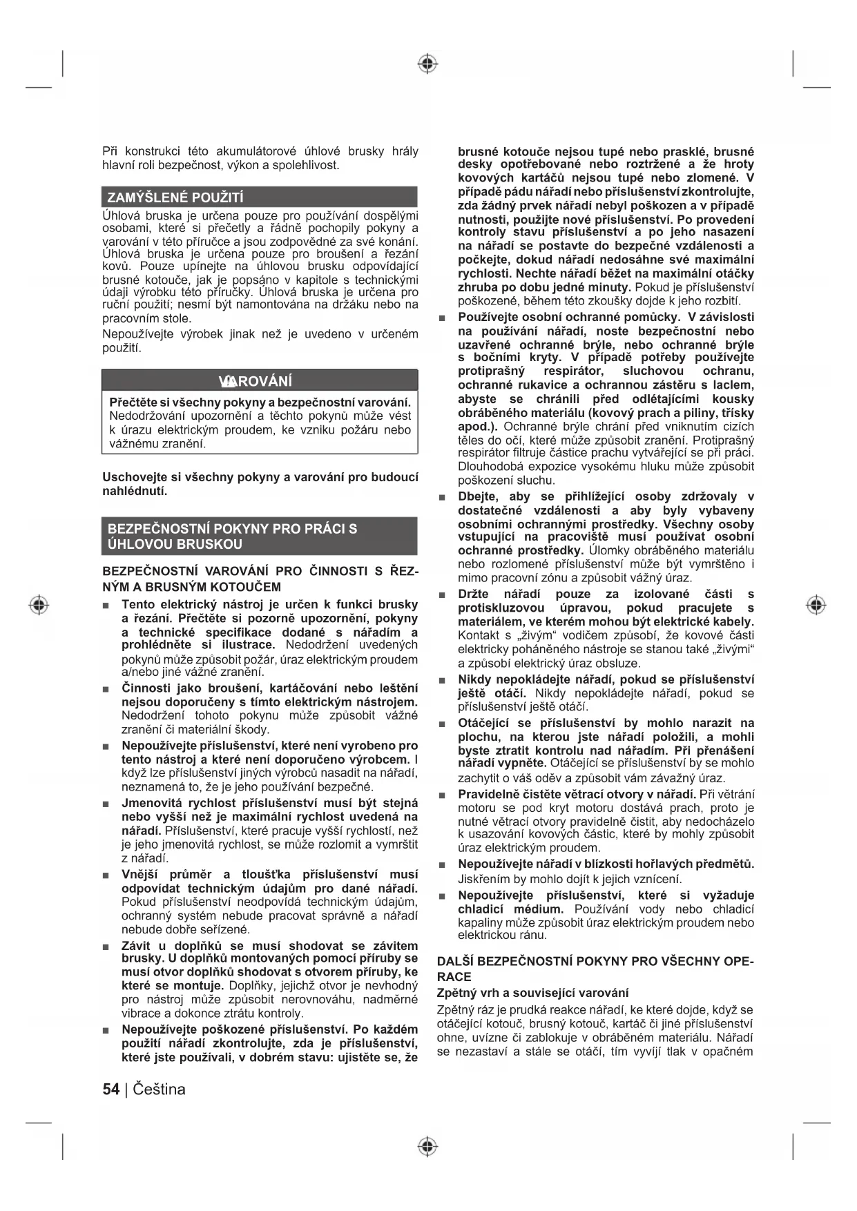 Úhlová bruska je určena pouze pro používání dospělými osobami, které si přečetly a řádně pochopily pokyny a varování v této příručce a jsou zodpovědné za své konání. Úhlová bruska je určena pouze pro broušení a řezání kovů. Pouze upínejte na úhlovou brusku odpovídající brusné kotouče, jak je popsáno v kapitole s technickými údaji výrobku této příručky. Úhlová bruska je určena pro ruční použití; nesmí být namontována na držáku nebo na pracovním stole. Nepoužívejte výrobek jinak než je uvedeno v určeném použití. VAROVÁNÍ Přečtěte si všechny pokyny a bezpečnostní varování. Nedodržování upozornění a těchto pokynů může vést k úrazu elektrickým proudem, ke vzniku požáru nebo vážnému zranění. Uschovejte si všechny pokyny a varování pro budoucí nahlédnutí. BEZPEČNOSTNÍ POKYNY PRO PRÁCI S ÚHLOVOU BRUSKOU BEZPEČNOSTNÍ VAROVÁNÍ PRO ČINNOSTI S ŘEZ- NÝM A BRUSNÝM KOTOUČEM ■ Tento elektrický nástroj je určen k funkci brusky a řezání. Přečtěte si pozorně upozornění, pokyny a technické specifikace dodané s nářadím a prohlédněte si ilustrace. Nedodržení uvedených pokynů může způsobit požár, úraz elektrickým proudem a/nebo jiné vážné zranění. ■ Činnosti jako broušení, kartáčování nebo leštění nejsou doporučeny s tímto elektrickým nástrojem. Nedodržení tohoto pokynu může způsobit vážné zranění či materiální škody. ■ Nepoužívejte příslušenství, které není vyrobeno pro tento nástroj a které není doporučeno výrobcem. I když lze příslušenství jiných výrobců nasadit na nářadí, neznamená to, že je jeho používání bezpečné. ■ Jmenovitá rychlost příslušenství musí být stejná nebo vyšší než je maximální rychlost uvedená na nářadí. Příslušenství, které pracuje vyšší rychlostí, než je jeho jmenovitá rychlost, se může rozlomit a vymrštit z nářadí. ■ Vnější průměr a tloušťka příslušenství musí odpovídat technickým údajům pro dané nářadí. Pokud příslušenství neodpovídá technickým údajům, ochranný systém nebude pracovat správně a nářadí nebude dobře seřízené. ■ Závit u doplňků se musí shodovat se závitem brusky. U doplňků montovaných pomocí příruby se musí otvor doplňků shodovat s otvorem příruby, ke které se montuje. Doplňky, jejichž otvor je nevhodný pro nástroj může způsobit nerovnováhu, nadměrné vibrace a dokonce ztrátu kontroly. ■ Nepoužívejte poškozené příslušenství. Po každém použití nářadí zkontrolujte, zda je příslušenství, které jste používali, v dobrém stavu: ujistěte se, že brusné kotouče nejsou tupé nebo prasklé, brusné desky opotřebované nebo roztržené a že hroty kovových kartáčů nejsou tupé nebo zlomené. V případě pádu nářadí nebo příslušenství zkontrolujte, zda žádný prvek nářadí nebyl poškozen a v případě nutnosti, použijte nové příslušenství. Po provedení kontroly stavu příslušenství a po jeho nasazení na nářadí se postavte do bezpečné vzdálenosti a počkejte, dokud nářadí nedosáhne své maximální rychlosti. Nechte nářadí běžet na maximální otáčky zhruba po dobu jedné minuty. Pokud je příslušenství poškozené, během této zkoušky dojde k jeho rozbití. ■ Používejte osobní ochranné pomůcky. V závislosti na používání nářadí, noste bezpečnostní nebo uzavřené ochranné brýle, nebo ochranné brýle s bočními kryty. V případě potřeby používejte protiprašný respirátor, sluchovou ochranu, ochranné rukavice a ochrannou zástěru s laclem, abyste se chránili před odlétajícími kousky obráběného materiálu (kovový prach a piliny, třísky apod.). Ochranné brýle chrání před vniknutím cizích těles do očí, které může způsobit zranění. Protiprašný respirátor filtruje částice prachu vytvářející se při práci. Dlouhodobá expozice vysokému hluku může způsobit poškození sluchu. ■ Dbejte, aby se přihlížející osoby zdržovaly v dostatečné vzdálenosti a aby byly vybaveny osobními ochrannými prostředky. Všechny osoby vstupující na pracoviště musí používat osobní ochranné prostředky. Úlomky obráběného materiálu nebo rozlomené příslušenství může být vymrštěno i mimo pracovní zónu a způsobit vážný úraz. ■ Držte nářadí pouze za izolované části s protiskluzovou úpravou, pokud pracujete s materiálem, ve kterém mohou být elektrické kabely. Kontakt s „živým“ vodičem způsobí, že kovové části elektricky poháněného nástroje se stanou také „živými“ a způsobí elektrický úraz obsluze. ■ Nikdy nepokládejte nářadí, pokud se příslušenství ještě otáčí. Nikdy nepokládejte nářadí, pokud se příslušenství ještě otáčí. ■ Otáčející se příslušenství by mohlo narazit na plochu, na kterou jste nářadí položili, a mohli byste ztratit kontrolu nad nářadím. Při přenášení nářadí vypněte. Otáčející se příslušenství by se mohlo zachytit o váš oděv a způsobit vám závažný úraz. ■ Pravidelně čistěte větrací otvory v nářadí. Při větrání motoru se pod kryt motoru dostává prach, proto je nutné větrací otvory pravidelně čistit, aby nedocházelo k usazování kovových částic, které by mohly způsobit úraz elektrickým proudem. ■ Nepoužívejte nářadí v blízkosti hořlavých předmětů. Jiskřením by mohlo dojít k jejich vznícení. ■ Nepoužívejte příslušenství, které si vyžaduje chladicí médium. Používání vody nebo chladicí kapaliny může způsobit úraz elektrickým proudem nebo elektrickou ránu. DALŠÍ BEZPEČNOSTNÍ POKYNY PRO VŠECHNY OPE- RACE Zpětný vrh a související varování Zpětný ráz je prudká reakce nářadí, ke které dojde, když se otá