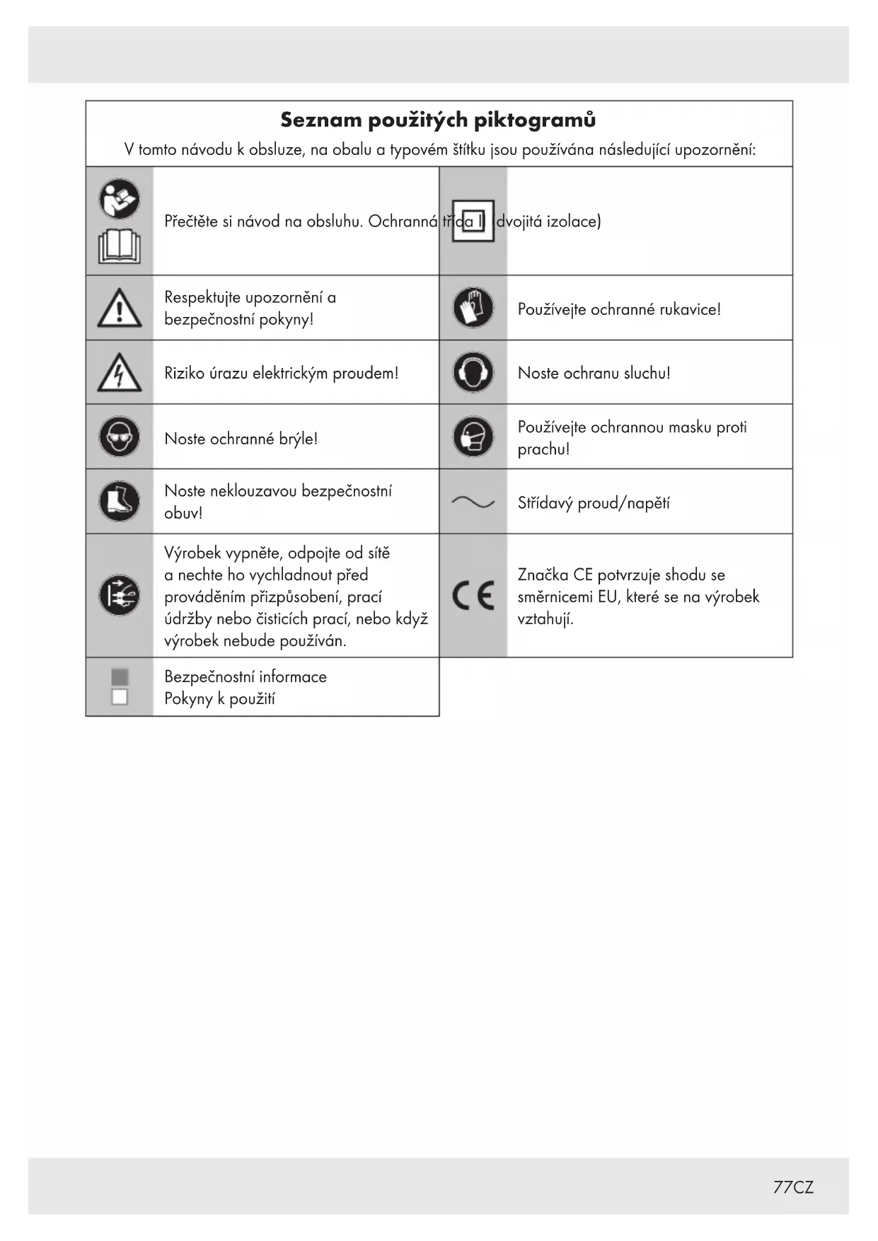 Výrobek vypněte, odpojte od sítě a nechte ho vychladnout před prováděním přizpůsobení, prací údržby nebo čisticích prací, nebo když výrobek nebude používán. Značka CE potvrzuje shodu se směrnicemi EU, které se na výrobek vztahují. Bezpečnostní informace Pokyny kpoužití78 CZ