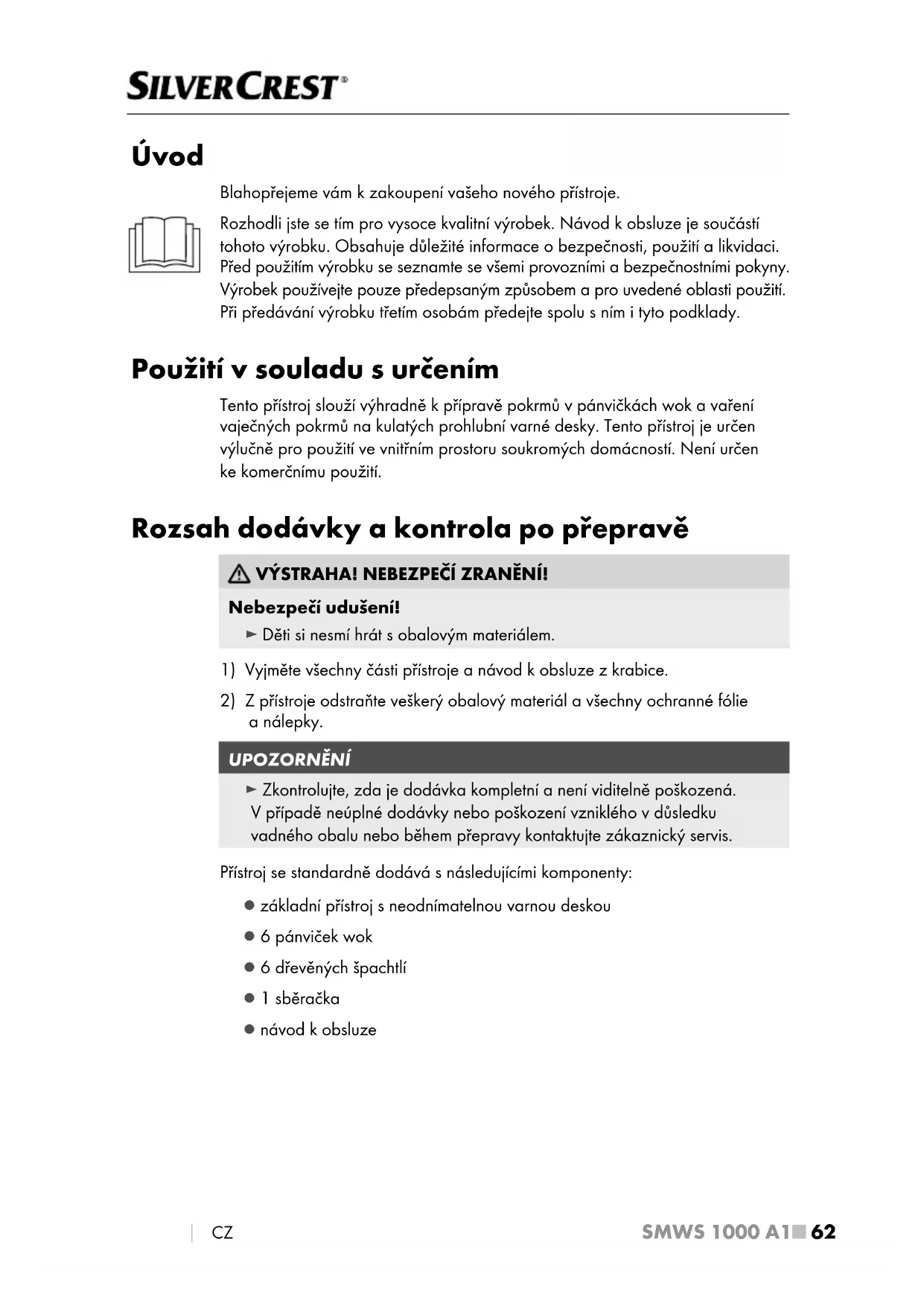 CZ Úvod Blahopřejeme vám kzakoupení vašeho nového přístroje. Rozhodli jste se tím pro vysoce kvalitní výrobek. Návod kobsluze je součástí tohoto výrobku. Obsahuje důležité informace obezpečnosti, použití a likvidaci. Před použitím výrobku se seznamte se všemi provozními a bezpečnostními pokyny. Výrobek používejte pouze předepsaným způsobem a pro uvedené oblasti použití. Při předávání výrobku třetím osobám předejte spolu sním ityto podklady. Použití vsouladu surčením Tento přístroj slouží výhradně kpřípravě pokrmů v pánvičkách wok a vaření vaječných pokrmů na kulatých prohlubní varné desky. Tento přístroj je určen výlučně pro použití ve vnitřním prostoru soukromých domácností. Není určen ke komerčnímu použití. Rozsah dodávky a kontrola po přepravě VÝSTRAHA! NEBEZPEČÍ ZRANĚNÍ! Nebezpečí udušení! ► Děti si nesmí hrát s obalovým materiálem.