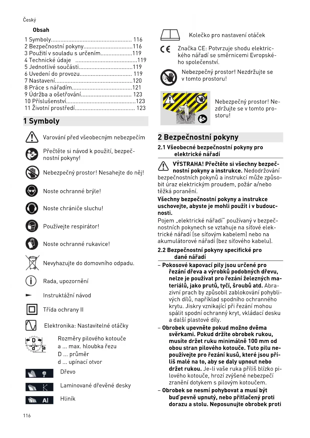 Rozměry pilového kotouče a ... max. hloubka řezu D ... průměr d ... upínací otvor Dřevo Laminované dřevěné desky Hliník Kolečko pro nastavení otáček Značka CE: Potvrzuje shodu elektric kého nářadí se směrnicemi Evropské ho společenství. Nebezpečný prostor! Nezdržujte se v tomto prostoru! Nebezpečný prostor! Ne zdržujte se v tomto pro storu! 2 Bezpečnostní pokyny
