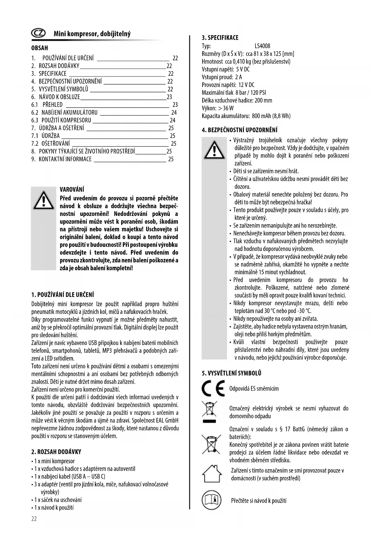 Dobíjitelný mini kompresor lze použít například propro huštění pneumatik motocyklů a jízdních kol, míčů a nafukovacích hraček. Díky programovatelné funkci vypnutí je možné předměty nahustit, aniž by se překročil optimální provozní tlak. Digitální displej lze použít pro sledování huštění. Zařízení je navíc vybaveno USB přípojkou k nabíjení baterií mobilních telefonů, smartpohonů, tabletů, MP3 přehrávačů a podobných zaří- zení a LED svítidlem. Toto zařízení není určeno k používání dětmi a osobami s omezenými mentálními schopnostmi a ani osobami bez potřebných odborných znalostí. Děti je nutné držet mimo dosah zařízení. Zařízení není určeno pro komerční použití. K použití dle určení patří i dodržování všech informací uvedených v tomto návodu, obzvláště dodržování bezpečnostních upozornění. Jakékoliv jiné použití se považuje za použití v rozporu s určením a může vést k věcným škodám a újmě na zdraví. Společnost EAL GmbH nepřevezme žádnou zodpovědnost za škody, které nastanou z důvodu použití v rozporu se stanoveným účelem.