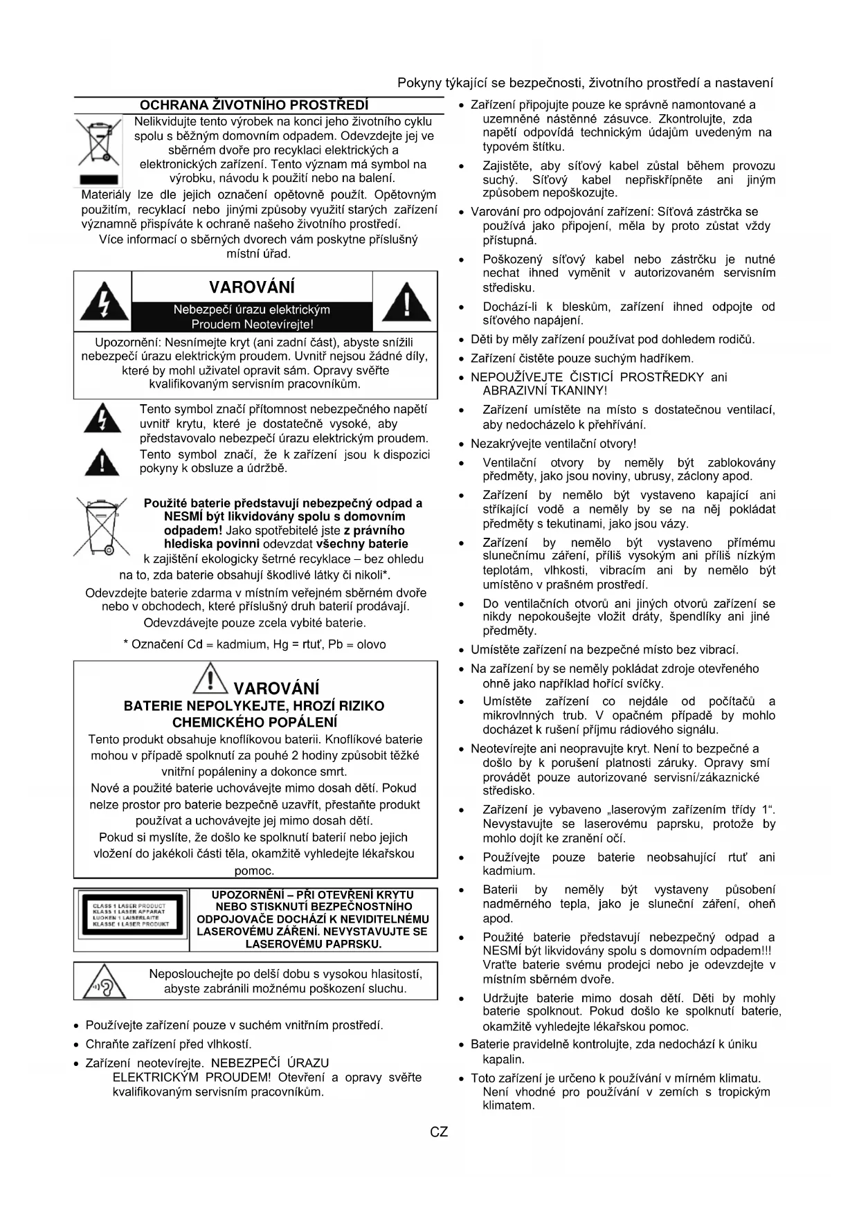 Používejte zařízení pouze v suchém vnitřním prostředí. Chraňte zařízení před vlhkostí. Zařízení neotevírejte. NEBEZPEČÍ ÚRAZU ELEKTRICKÝM PROUDEM! Otevření a opravy svěřte kvalifikovaným servisním pracovníkům. Zařízení připojujte pouze ke správně namontované a uzemněné nástěnné zásuvce. Zkontrolujte, zda napětí odpovídá technickým údajům uvedeným na typovém štítku. Zajistěte, aby síťový kabel zůstal během provozu suchý. Síťový kabel nepřiskřípněte ani jiným způsobem nepoškozujte. Varování pro odpojování zařízení: Síťová zástrčka se používá jako připojení, měla by proto zůstat vždy přístupná. Poškozený síťový kabel nebo zástrčku je nutné nechat ihned vyměnit v autorizovaném servisním středisku. Dochází-li k bleskům, zařízení ihned odpojte od síťového napájení. Děti by měly zařízení používat pod dohledem rodičů. Zařízení čistěte pouze suchým hadříkem. NEPOUŽÍVEJTE ČISTICÍ PROSTŘEDKY ani ABRAZIVNÍ TKANINY! Zařízení umístěte na místo s dostatečnou ventilací, aby nedocházelo k přehřívání. Nezakrývejte ventilační otvory! Ventilační otvory by neměly být zablokovány předměty, jako jsou noviny, ubrusy, záclony apod. Zařízení by nemělo být vystaveno kapající ani stříkající vodě a neměly by se na něj pokládat předměty s tekutinami, jako jsou vázy. Zařízení by nemělo být vystaveno přímému slunečnímu záření, příliš vysokým ani příliš nízkým teplotám, vlhkosti, vibracím ani by nemělo být umístěno v prašném prostředí. Do ventilačních otvorů ani jiných otvorů zařízení se nikdy nepokoušejte vložit dráty, špendlíky ani jiné předměty. Umístěte zařízení na bezpečné místo bez vibrací. Na zařízení by se neměly pokládat zdroje otevřeného ohně jako například hořící svíčky. Umístěte zařízení co nejdále od počítačů a mikrovlnných trub. V opačném případě by mohlo docházet k rušení příjmu rádiového signálu. Neotevírejte ani neopravujte kryt. Není to bezpečné a došlo by k porušení platnosti záruky. Opravy smí provádět pouze autorizované servisní/zákaznické středisko. Zařízení je vybaveno „laserovým zařízením třídy 1“. Nevystavujte se laserovému paprsku, protože by mohlo dojít ke zranění očí. Používejte pouze baterie neobsahující rtuť ani kadmium. Baterii by neměly být vystaveny působení nadměrného tepla, jako je sluneční záření, oheň apod. Použité baterie představují nebezpečný odpad a NESMÍ být likvidovány spolu s domovním odpadem!!! Vraťte baterie svému prodejci nebo je odevzdejte v místním sběrném dvoře. Udržujte baterie mimo dosah dětí. Děti by mohly baterie spolknout. Pokud došlo ke spolknutí baterie, okamžitě vyhledejte lékařskou pomoc. Baterie pravidelně kontrolujte, zda nedochází k úniku kapalin. Toto zařízení je určeno k používání v mírném klimatu. Není vhodné pro používání v zemích s tropickým klimatem.PDB1910 / návod k obsluze – čeština