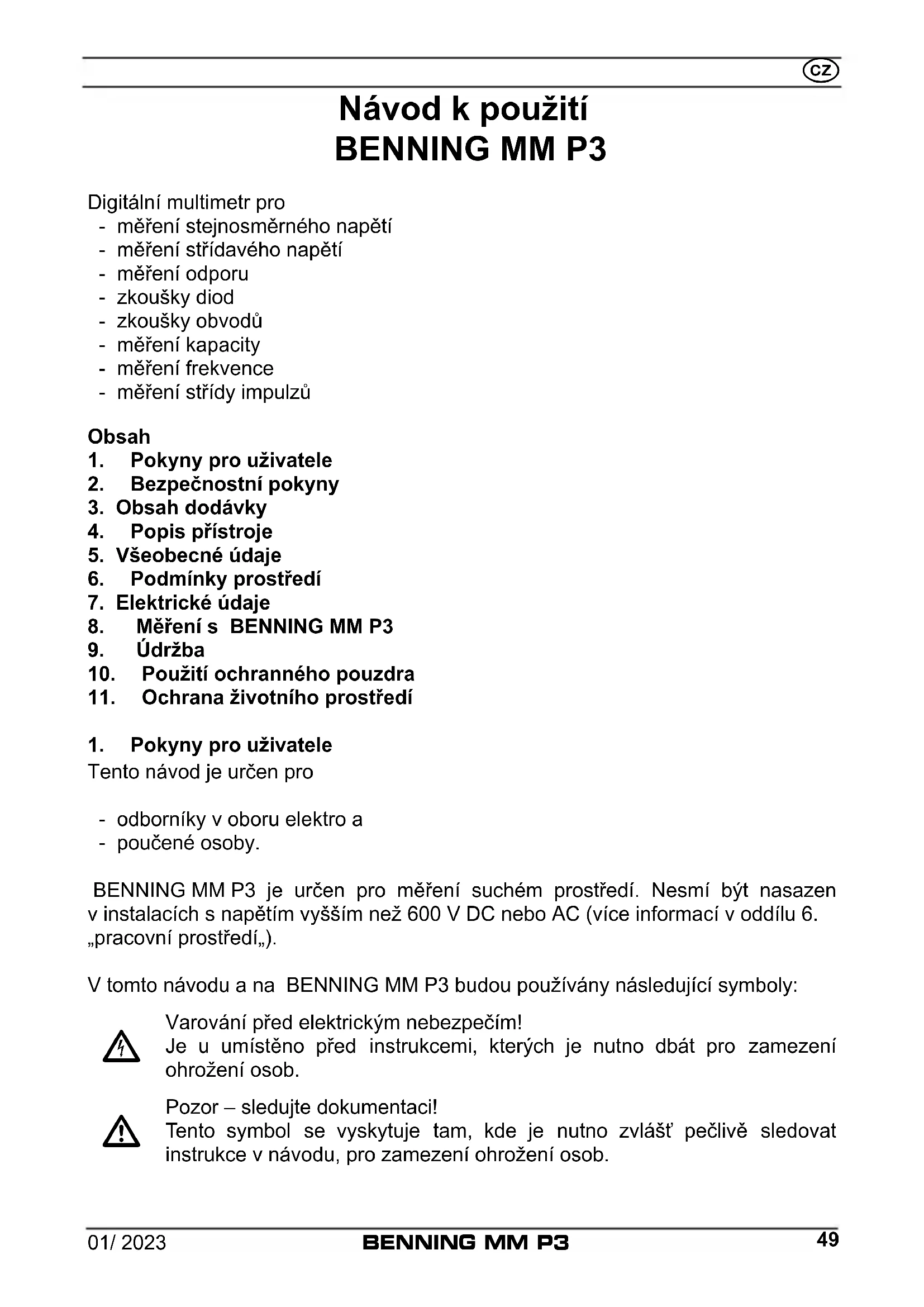 MM P3 - Multimetr BENNING - Bezplatný návod k obsluze