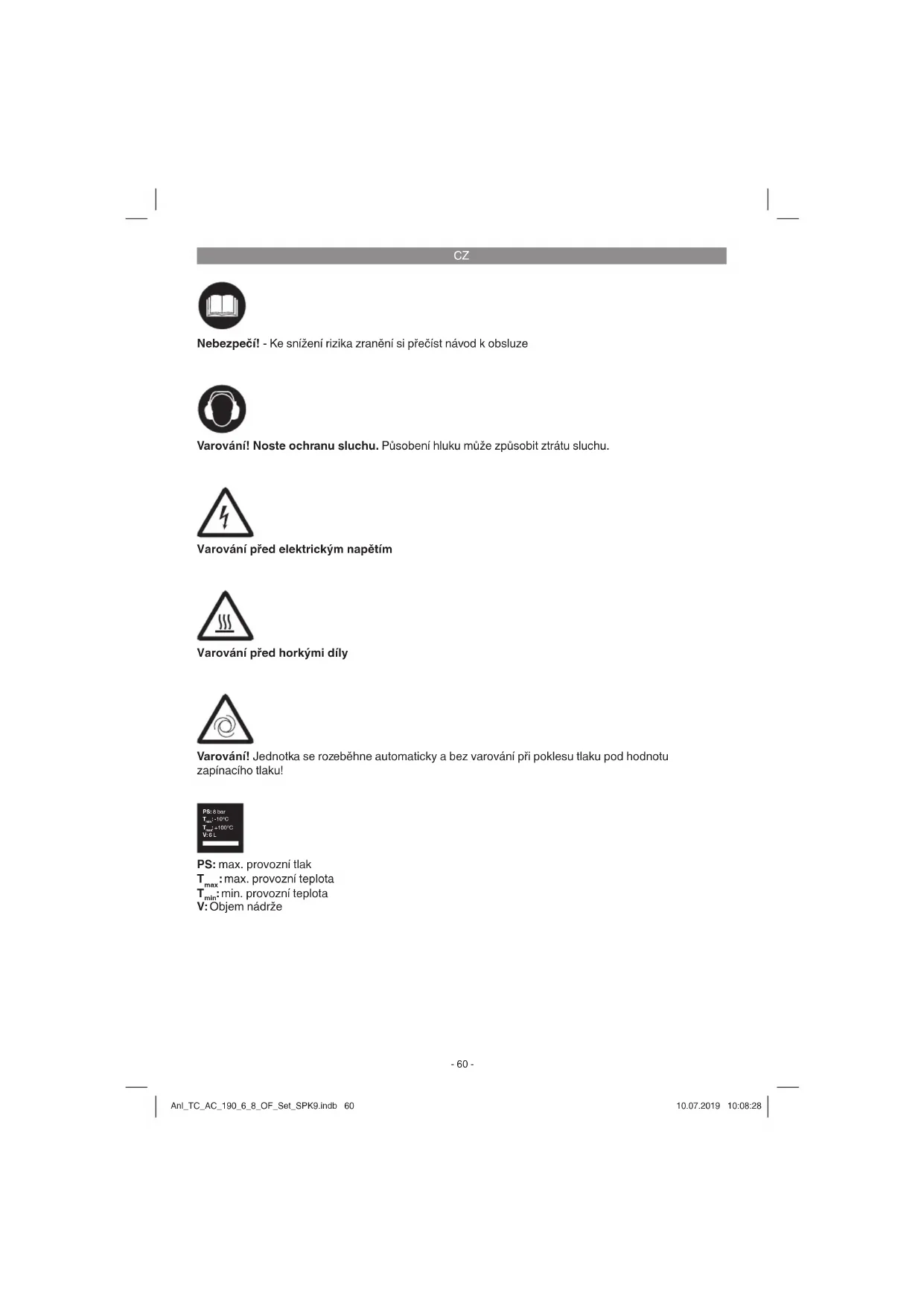 Varování! Noste ochranu sluchu. Působení hluku může způsobit ztrátu sluchu. Nebezpečí! - Ke snížení rizika zranění si přečíst návod k obsluze Varování před elektrickým napětím Varování před horkými díly Varování! Jednotka se rozeběhne automaticky a bez varování při poklesu tlaku pod hodnotu zapínacího tlaku! PS: max. provozní tlak