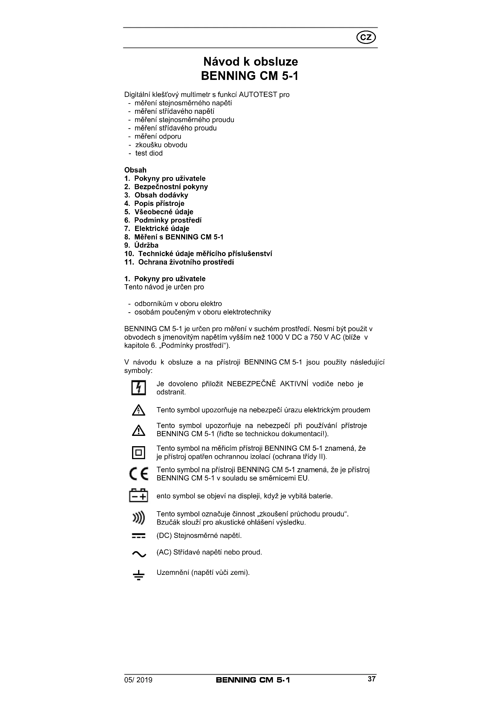 Šetřete životní prostředí! Baterie nesmí do běžného domovního odpadu! Vyhazujte baterie jen na místech k tomu určených.BENNING CM 5-1 05/ 2019