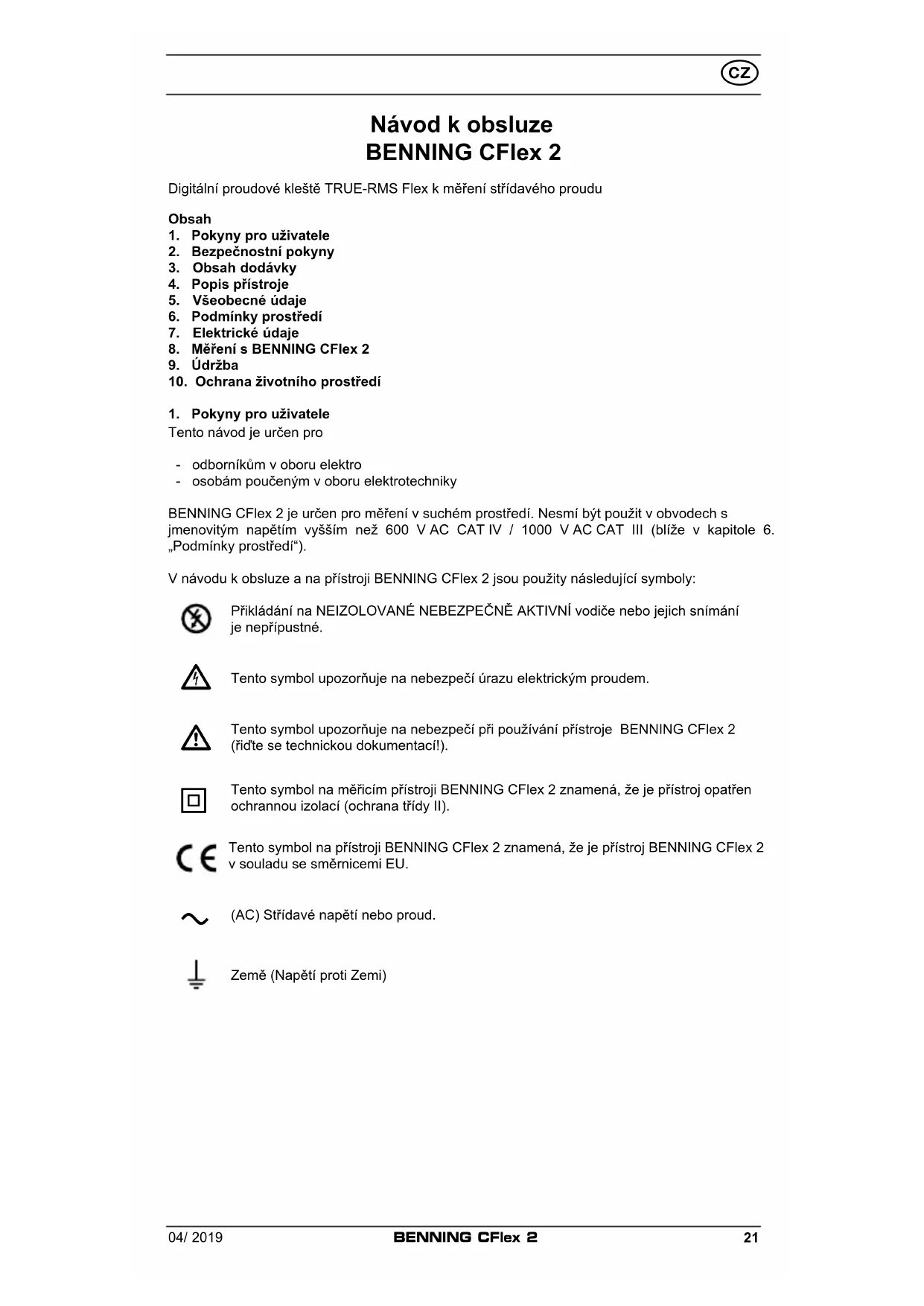 Návod k obsluze BENNING CFlex 2 Digitální proudové kleště TRUE-RMS Flex k měření střídavého prouduObsah1. Pokyny pro uživatele2. Bezpečnostní pokyny3. Obsah dodávky4. Popis přístroje5. Všeobecné údaje6. Podmínky prostředí7. Elektrické údaje8. Měření s BENNING CFlex 29. Údržba10. Ochrana životního prostředí1. Pokyny pro uživateleTento návod je určen pro - odborníkům v oboru elektro - osobám poučeným v oboru elektrotechnikyBENNING CFlex 2 je určen pro měření v suchém prostředí. Nesmí být použit v obvodech s jmenovitým napětím vyšším než 600 V AC CAT IV / 1000 V AC CAT III (blíže v kapitole 6. „Podmínky prostředí“).V návodu k obsluze a na přístroji BENNING CFlex 2 jsou použity následující symboly:Přikládání na NEIZOLOVANÉ NEBEZPEČNĚ AKTIVNÍ vodiče nebo jejich snímání je nepřípustné. Tento symbol upozorňuje na nebezpečí úrazu elektrickým proudem. Tento symbol upozorňuje na nebezpečí při používání přístroje BENNING CFlex 2 (řiďte se technickou dokumentací!). Tento symbol na měřicím přístroji BENNING CFlex 2 znamená, že je přístroj opatřen ochrannou izolací (ochrana třídy II).Tento symbol na přístroji BENNING CFlex 2 znamená, že je přístroj BENNING CFlex 2 v souladu se směrnicemi EU. (AC) Střídavé napětí nebo proud.Země (Napětí proti Zemi)04/ 2019 BENNING CFlex 2