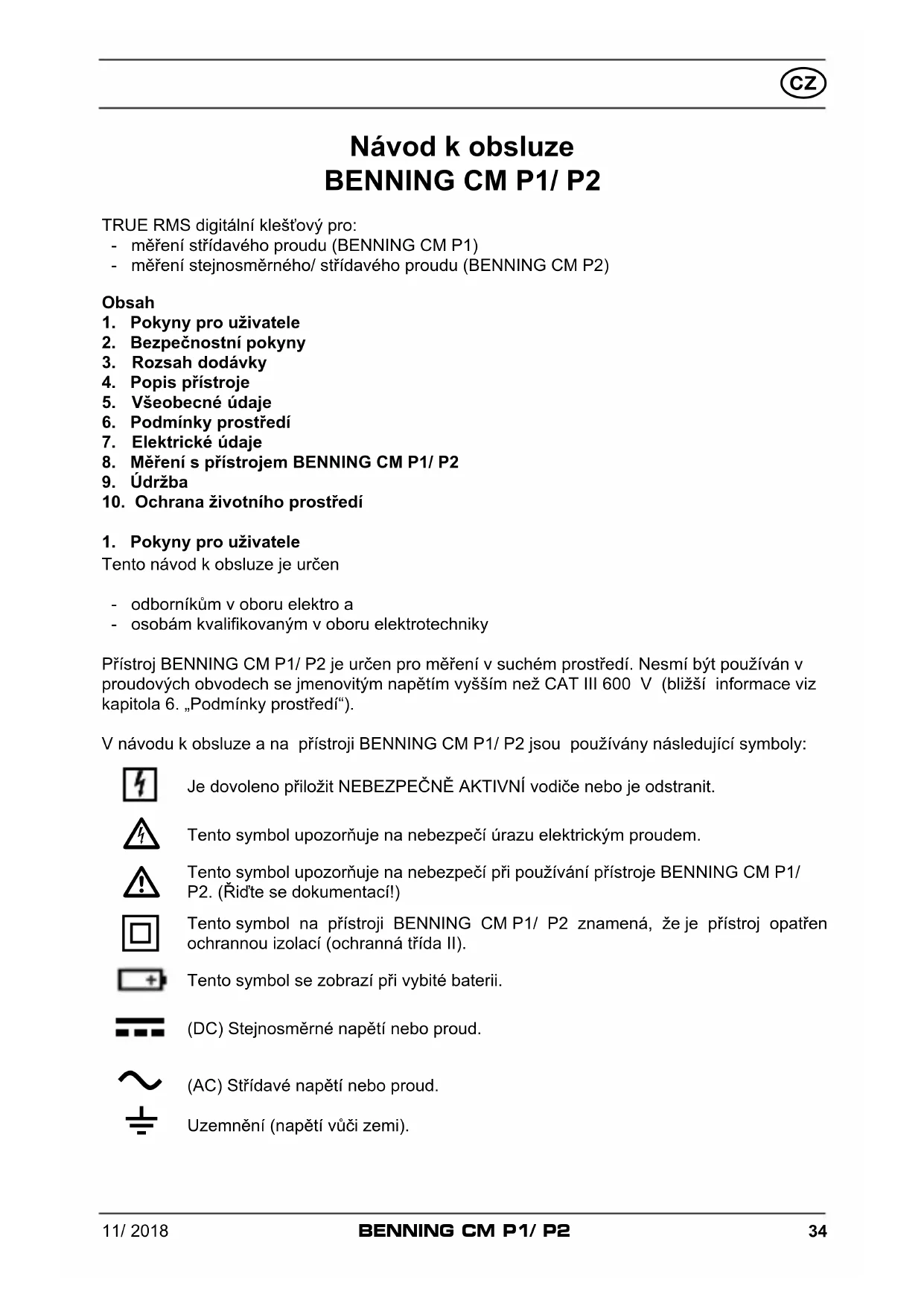 TRUE RMS digitální klešťový pro: - měření střídavého proudu (BENNING CM P1) - měření stejnosměrného/ střídavého proudu (BENNING CM P2)Obsah 1. Pokyny pro uživatele 2. Bezpečnostní pokyny 3. Rozsah dodávky 4. Popis přístroje 5. Všeobecné údaje 6. Podmínky prostředí 7. Elektrické údaje 8. Měření s přístrojem BENNING CM P1/ P29. Údržba 10. Ochrana životního prostředí 1. Pokyny pro uživatele Tento návod k obsluze je určen - odborníkům v oboru elektro a - osobám kvalifikovaným v oboru elektrotechniky Přístroj BENNING CM P1/ P2 je určen pro měření v suchém prostředí. Nesmí být používán v proudových obvodech se jmenovitým napětím vyšším než CAT III 600 V (bližší informace viz kapitola 6. „Podmínky prostředí“). V návodu k obsluze a na přístroji BENNING CM P1/ P2 jsou používány následující symboly:Je dovoleno přiložit NEBEZPEČNĚ AKTIVNÍ vodiče nebo je odstranit. Tento symbol upozorňuje na nebezpečí úrazu elektrickým proudem. Tento symbol upozorňuje na nebezpečí při používání přístroje BENNING CM P1/ P2. (Řiďte se dokumentací!) Tento symbol na přístroji BENNING CM P1/ P2 znamená, že je přístroj opatřen ochrannou izolací (ochranná třída II).Tento symbol se zobrazí při vybité baterii.(DC) Stejnosměrné napětí nebo proud.