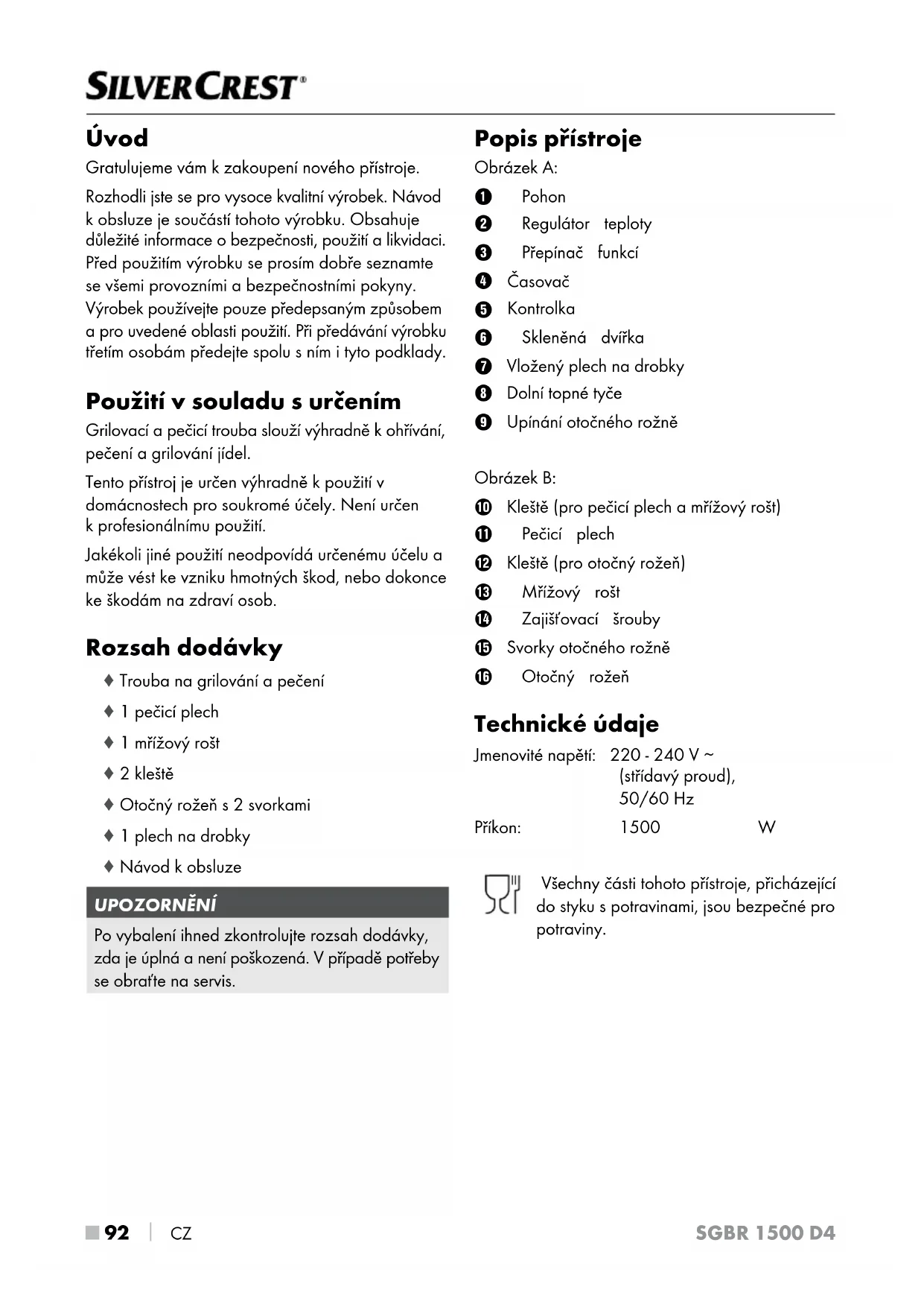 Kontrolka 6 Skleněná dvířka 7 Vložený plech na drobky 8 Dolní topné tyče 9 Upínání otočného rožně ObrázekB: 0 Kleště (pro pečicí plech a mřížový rošt) q Pečicí plech w Kleště (pro otočný rožeň) e Mřížový rošt r Zajišťovací šrouby t Svorky otočného rožně z Otočný rožeň Technické údaje Jmenovité napětí: 220 - 240 V ∼ (střídavý proud), 50/60 Hz Příkon: 1500 W Všechny části tohoto přístroje, přicházející do styku s potravinami, jsou bezpečné pro potraviny.SGBR 1500 D4 CZ