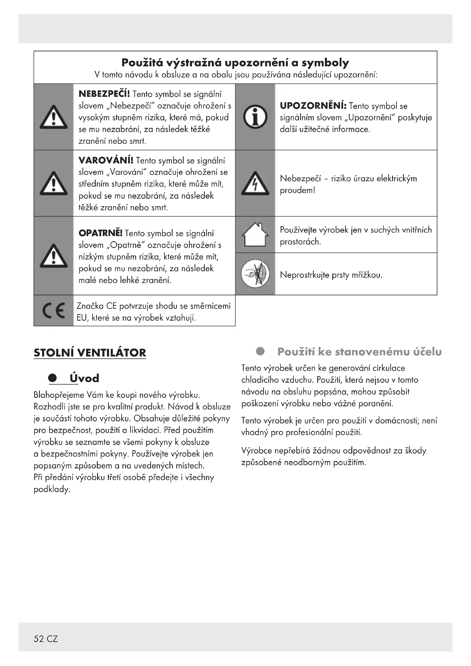 VAROVÁNÍ! Neponořujte elektrické části výrobku do vody nebo jiných kapalin. Nikdy výrobek nedržte pod tekoucí vodou. Zadní mřížka [4] ani přední mřížka [] nesmí být za žádných okolností odstraněna. Zadní mřížku[4] a přední mřížku[] čistěte pouze vysavačem a navlhčeným hadříkem. Skladování Pokud není výrobek používán, skladujte ho v originálním obalu. Uchovávejte výrobek a suchém místě mimo dosah dětí.58 CZ Zlikvidování Obal se skládá z ekologických materiálů, které můžete zlikvidovat prostřednictvím místních sběren recyklovatelných materiálů. Při třídění odpadu se řiďte podle označení obalových materiálů zkratkami (a) a čísly (b), s následujícím významem: 1–7: umělé hmoty / 20–22: papír a lepenka / 80–98: složené látky. Výrobek a obalové materiály jsou recyklovatelné, zlikvidujte je odděleně pro lepší odstranění odpadu. Logo Triman platí jen pro Francii. O možnostech likvidace vysloužilých zařízení se informujte u správy vaší obce nebo města. V zájmu ochrany životního prostředí vysloužilý výrobek nevyhazujte do domovního odpadu, ale předejte k odborné likvidaci. O sběrnách a jejich otevíracích hodinách se můžete informovat u příslušné správy města nebo obce.59 CZ Záruka Výrobek byl vyroben s nejvyšší pečlivostí podle přísných kvalitativních směrnic a před odesláním prošel výstupní kontrolou. V případě závad máte možnost uplatnění zákonných práv vůči prodejci. Vaše práva ze zákona nejsou omezena naší níže uvedenou zárukou. Na tento artikl platí 3 záruka od data zakoupení. Záruční lhůta začíná od data zakoupení. Uschovejte si dobře originál pokladní stvrzenky. Tuto stvrzenku budete potřebovat jako doklad o zakoupení. Pokud se do 3 let od data zakoupení tohoto výrobku vyskytne vada materiálu nebo výrobní vada, výrobek Vám – dle našeho rozhodnutí – bezplatně opravíme nebo vyměníme. Tato záruka zaniká, jestliže se výrobek poškodí, neodborně použil nebo neobdržel pravidelnou údržbu. Záruka platí na vady materiálu a výrobní vady. Tato záruka se nevztahuje na díly výrobku podléhající opotřebení (např. na baterie), dále na poškození křehkých, choulostivých dílů, např. vypínačů, akumulátorů nebo dílů zhotovených ze skla. Postup v případě uplatňování záruky Pro zajištění rychlého zpracování Vašeho případu se řiďte následujícími pokyny: Pro všechny požadavky si připravte pokladní stvrzenku a číslo artiklu (IAN384782_2107) jako doklad o zakoupení. Číslo artiklu najdete na typovém štítku, gravuře, titulní stránce návodu (vlevo dole) nebo na nálepce na zadní nebo spodní straně. V případě poruch funkce nebo jiných závad nejdříve kontaktujte, telefonicky nebo e-mailem, v následujícím textu uvedené servisní oddělení. Výrobek registrovaný jako vadný potom můžete s přiloženým dokladem o zakoupení (pokladní stvrzenkou) a údaji k závadě a kdy k ní došlo, bezplatně zaslat na adresu servisu, která Vám byla sdělena. Servis Servis Česká republika Tel.: 800600632 E-Mail: owim@lidl.cz60 SK Použité výstražné upozornenia a symboly .......................... Strana 61 Úvod....................................................................... Strana 61 Použitie v súlade s určením..................................................... Strana 61 Rozsah dodávky............................................................. Strana 62 Popis súčiastok .............................................................. Strana 62 Technické údaje . . . . . . . . . . . . . . . . . . . . . . . . . . . . . . . . . . . . . . . . . . . . . . . . . . . . . . . . . . . . . Strana 62 Bezpečnostné upozornenia ............................................ Strana 63 Pred použitím ............................................................ Strana 65 Vybalenie.................................................................. Strana 65 Montáž ................................................................... Strana 65 Nastavenie náklonu.......................................................... Strana 65 Obsluha ................................................................... Strana 66 Rýchlosť ventilátora .......................................................... Strana 66 Oscilácia .................................................................. Strana 66 Čistenie a starostlivosť.................................................. Strana 66 Skladovanie.............................................................. Strana 66 Likvidácia................................................................. Strana 67 Záruka .................................................................... Strana 68 Postup v prípade poškodenia v záruke ........................................... Strana 68 Servis...................................................................... Strana 6861 SK Použité výstražné upozornenia a symboly V tejto príručke a na obale sa používajú nasledujúce upozornenia: NEBEZPEČENSTVO! Tento symbol so signálnym slovom „Nebezpečenstvo“ označuje nebezpečenstvo s vysokým stupňom rizika, ktoré, ak sa mu nevyhnete, bude mať za následok smrť alebo vážne zranenie. UPOZORNENIE: Tento symbol so signálnym slovom „Upozornenie“ ponúka ďalšie užitočné informácie. VÝSTRAHA! Tento symbol so signálnym slovom „Výstraha“ označuje nebezpečenstvo so stredným stupňom rizika, ktoré, ak sa mu nevyhnete, bude mať za následok vážne zranenie alebo smrť. Nebezpečenstvo– úrazu elektrickým prúdom! POZOR! Tento symbol so signálnym slovom „Pozor“ označuje nebezpečenstvo s nízkym stupňom rizika, ktoré, ak sa mu nevyhnete, bude mať za následok ľahké alebo stredne ťažké zranenie. Produkt používajte len v suchých interiéroc