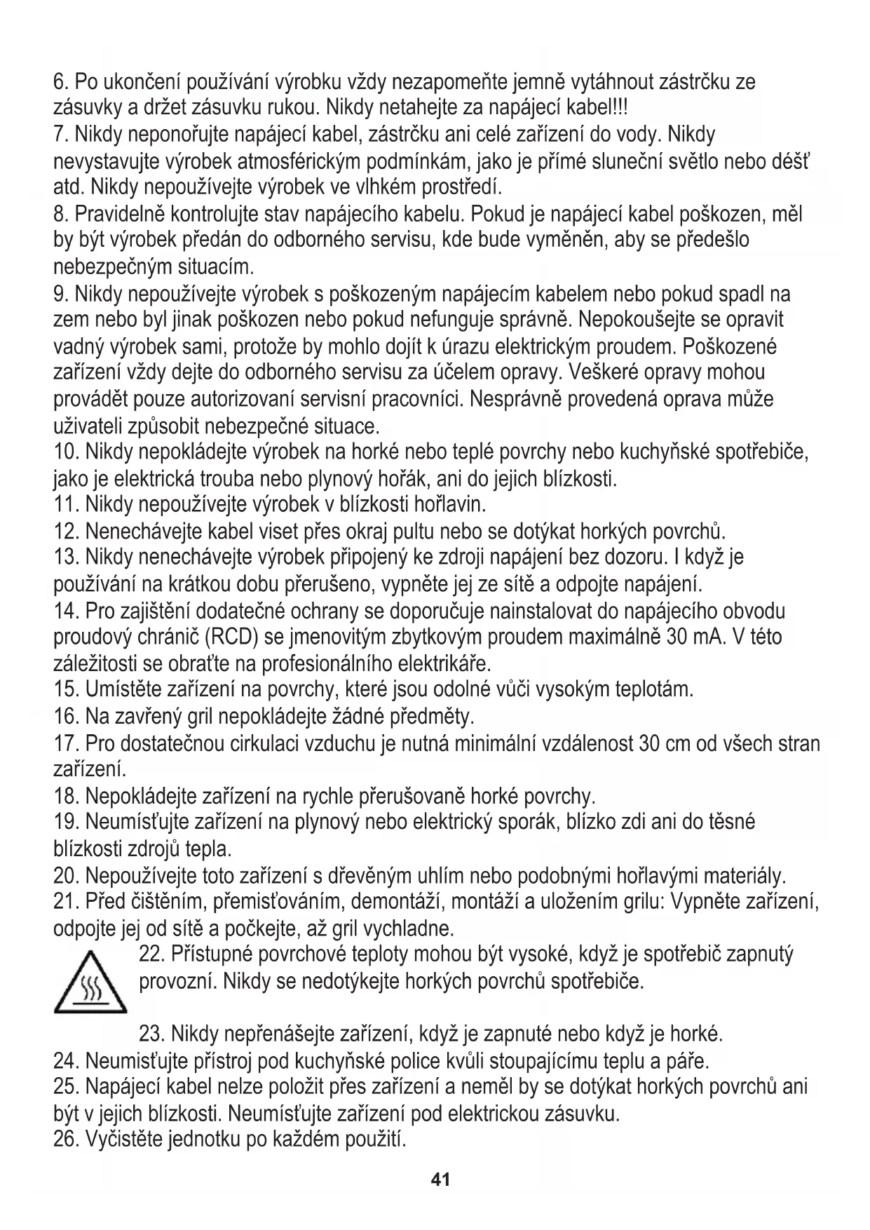 25. Napájecí kabel nelze položit přes zařízení a neměl by se dotýkat horkých povrchů ani