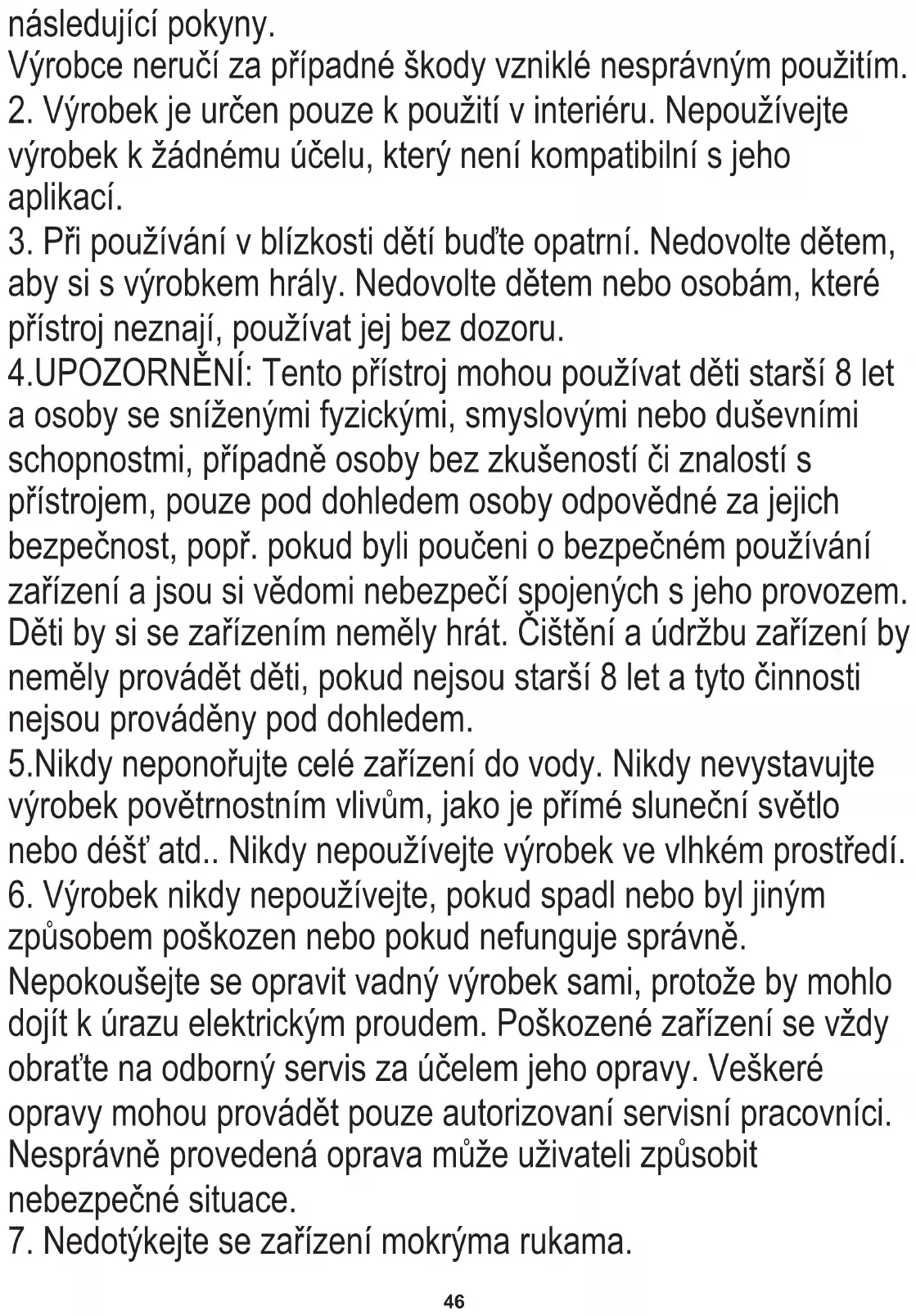 4.UPOZORNĚNÍ: Tento přístroj mohou používat děti starší 8 let a osoby se sníženými fyzickými, smyslovými nebo duševními schopnostmi, případně osoby bez zkušeností či znalostí s přístrojem, pouze pod dohledem osoby odpovědné za jejich bezpečnost, popř. pokud byli poučeni o bezpečném používání zařízení a jsou si vědomi nebezpečí spojených s jeho provozem. Děti by si se zařízením neměly hrát. Čištění a údržbu zařízení by neměly provádět děti, pokud nejsou starší 8 let a tyto činnosti nejsou prováděny pod dohledem. 5.Nikdy neponořujte celé zařízení do vody. Nikdy nevystavujte výrobek povětrnostním vlivům, jako je přímé sluneční světlo nebo déšť atd.. Nikdy nepoužívejte výrobek ve vlhkém prostředí.