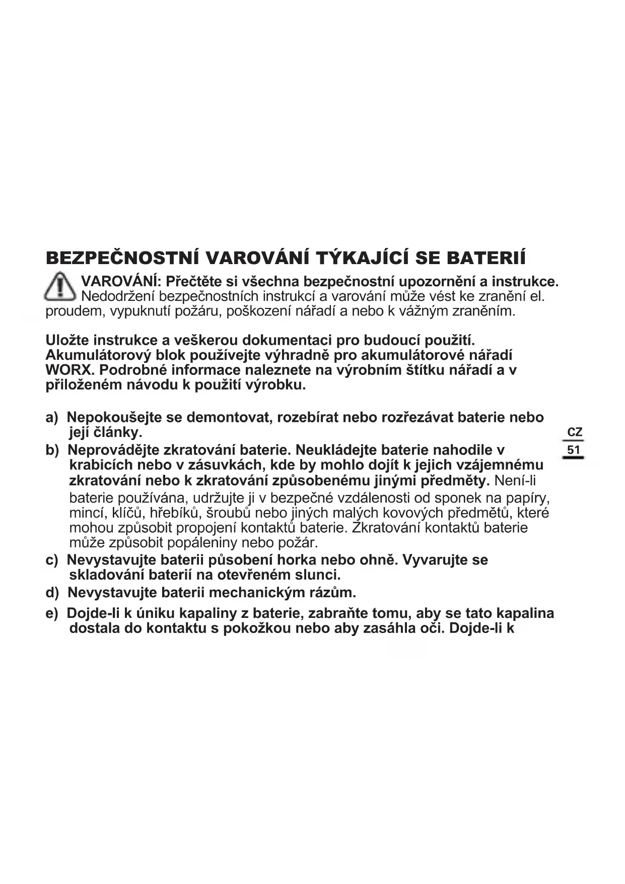 BEZPEČNOSTNÍ VAROVÁNÍ TÝKAJÍCÍ SE BATERIÍ VAROVÁNÍ: Přečtěte si všechna bezpečnostní upozornění a instrukce. Nedodržení bezpečnostních instrukcí a varování může vést ke zranění el. proudem, vypuknutí požáru, poškození nářadí a nebo k vážným zraněním. Uložte instrukce a veškerou dokumentaci pro budoucí použití. Akumulátorový blok používejte výhradně pro akumulátorové nářadí WORX. Podrobné informace naleznete na výrobním štítku nářadí a v přiloženém návodu k použití výrobku. a) Nepokoušejte se demontovat, rozebírat nebo rozřezávat baterie nebo její články. b) Neprovádějte zkratování baterie. Neukládejte baterie nahodile v krabicích nebo v zásuvkách, kde by mohlo dojít k jejich vzájemnému zkratování nebo k zkratování způsobenému jinými předměty. Není-li baterie používána, udržujte ji v bezpečné vzdálenosti od sponek na papíry, mincí, klíčů, hřebíků, šroubů nebo jiných malých kovových předmětů, které mohou způsobit propojení kontaktů baterie. Zkratování kontaktů baterie může způsobit popáleniny nebo požár. c) Nevystavujte baterii působení horka nebo ohně. Vyvarujte se skladování baterií na otevřeném slunci. d) Nevystavujte baterii mechanickým rázům. e) Dojde-li k úniku kapaliny z baterie, zabraňte tomu, aby se tato kapalina dostala do kontaktu s pokožkou nebo aby zasáhla oči. Dojde-li k52