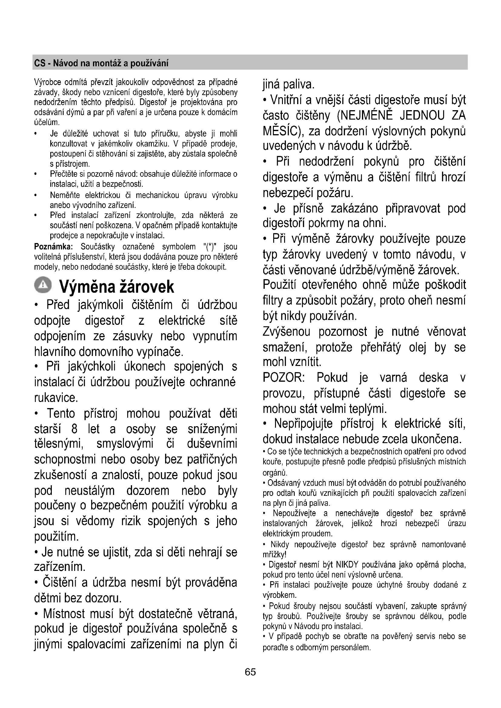 Zamontować ponownie kratkę. W przypadku, gdy oświetlenie nie działa należy najpierw sprawdzić, czy lampki zostały prawidłowo zamontowane. Jeżeli po przeprowadzeniu takiej kontroli oświetlenie nadal nie działa, należy zwrócić się do serwisu.65 CS - Návod na montáž a používání Výrobce odmítá převzít jakoukoliv odpovědnost za případné závady, škody nebo vznícení digestoře, které byly způsobeny nedodržením těchto předpisů. Digestoř je projektována pro odsávání dýmů a par při vaření a je určena pouze k domácím účelům.