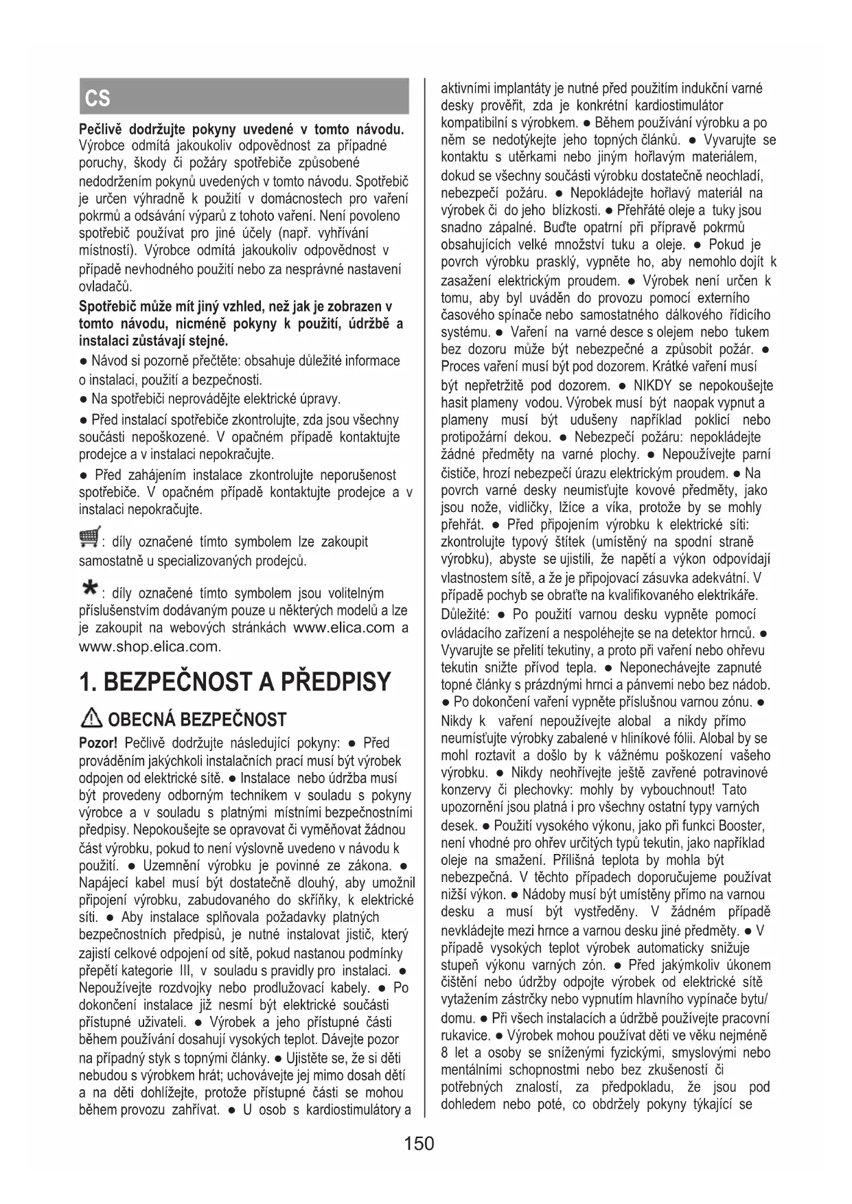 Jeśli po wykonaniu powyższych kontroli problem wciąż trwa, należy skontaktować się z najbliższym Serwisem Ob- sługi. 149CS Pečlivě dodržujte pokyny uvedené v tomto návodu. Výrobce odmítá jakoukoliv odpovědnost za případné poruchy, škody či požáry spotřebiče způsobené nedodržením pokynů uvedených v tomto návodu. Spotřebič je určen výhradně k použití v domácnostech pro vaření pokrmů a odsávání výparů z tohoto vaření. Není povoleno spotřebič používat pro jiné účely (např. vyhřívání místností). Výrobce odmítá jakoukoliv odpovědnost v případě nevhodného použití nebo za nesprávné nastavení ovladačů. Spotřebič může mít jiný vzhled, než jak je zobrazen v tomto návodu, nicméně pokyny k použití, údržbě a instalaci zůstávají stejné. ● Návod si pozorně přečtěte: obsahuje důležité informace o instalaci, použití a bezpečnosti. ● Na spotřebiči neprovádějte elektrické úpravy. ● Před instalací spotřebiče zkontrolujte, zda jsou všechny součásti nepoškozené. V opačném případě kontaktujte prodejce a v instalaci nepokračujte. ● Před zahájením instalace zkontrolujte neporušenost spotřebiče. V opačném případě kontaktujte prodejce a v instalaci nepokračujte. : díly označené tímto symbolem lze zakoupit samostatně u specializovaných prodejců. : díly označené tímto symbolem jsou volitelným příslušenstvím dodávaným pouze u některých modelů a lze je zakoupit na webových stránkách www.elica.com a www.shop.elica.com.