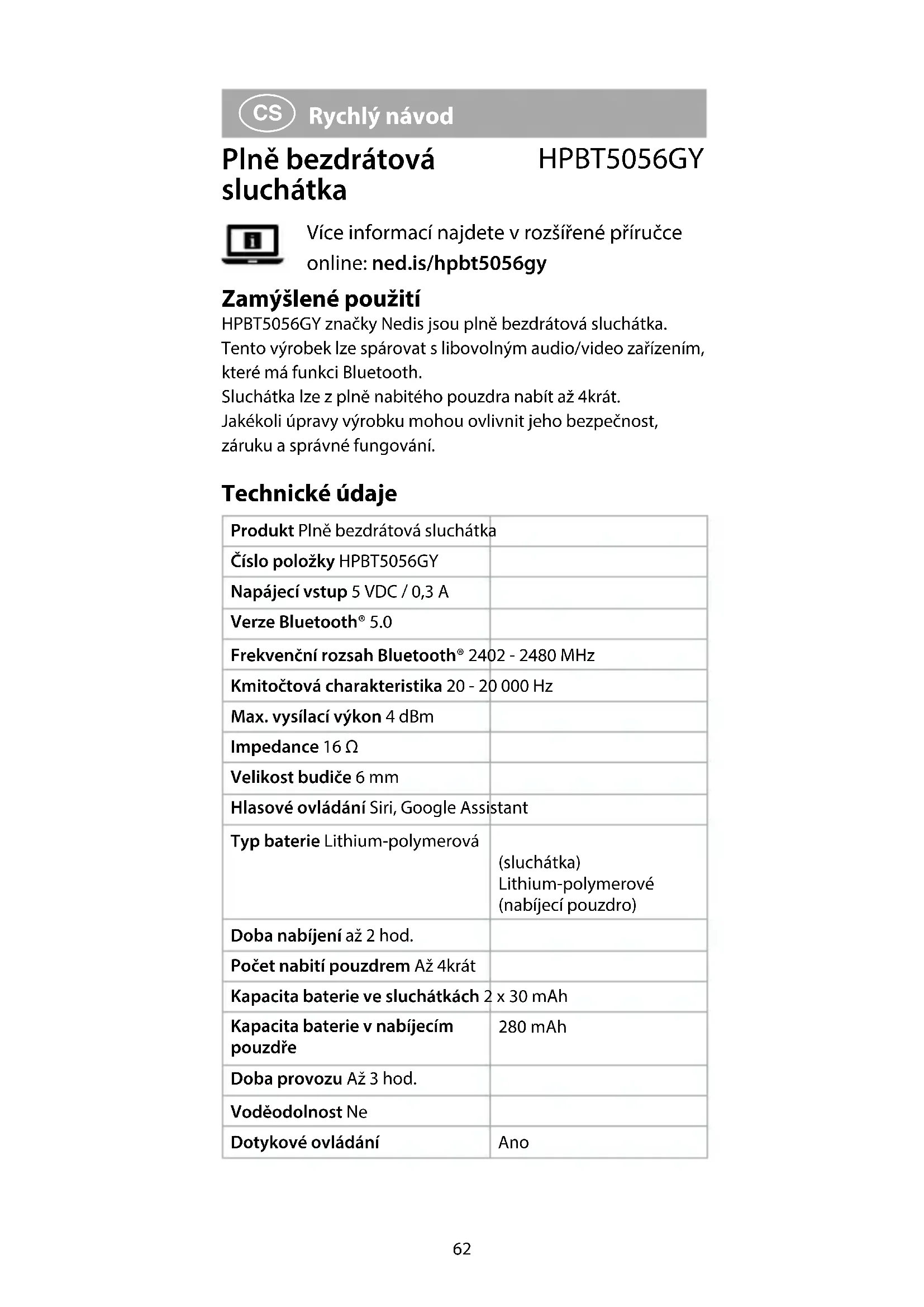 Rychlý návod Plně bezdrátová sluchátka HPBT5056GY Více informací najdete v rozšířené příručce online: ned.is/hpbt5056gy Zamýšlené použití HPBT5056GY značky Nedis jsou plně bezdrátová sluchátka. Tento výrobek lze spárovat slibovolným audio/video zařízením, které má funkci Bluetooth. Sluchátka lze z plně nabitého pouzdra nabít až 4krát. Jakékoli úpravy výrobku mohou ovlivnit jeho bezpečnost, záruku a správné fungování. Technické údaje Produkt Plně bezdrátová sluchátka Číslo položky HPBT5056GY Napájecí vstup 5 VDC / 0,3 A Verze Bluetooth® 5.0 Frekvenční rozsah Bluetooth® 2402 - 2480 MHz Kmitočtová charakteristika 20 - 20000 Hz Max. vysílací výkon 4 dBm Impedance 16 Ω Velikost budiče 6mm Hlasové ovládání Siri, Google Assistant Typ baterie Lithium-polymerová (sluchátka) Lithium-polymerové (nabíjecí pouzdro) Doba nabíjení až 2 hod. Počet nabití pouzdrem Až 4krát Kapacita baterie ve sluchátkách 2 x 30 mAh Kapacita baterie vnabíjecím pouzdře 280 mAh Doba provozu Až 3 hod. Voděodolnost Ne Dotykové ovládání Ano63 Hlavní části (obrázek A)