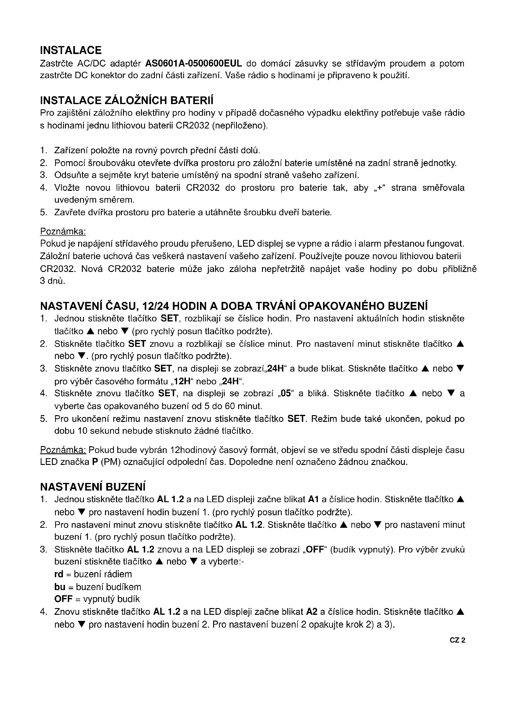 Poznámka: Pokud je napájení střídavého proudu přerušeno, LED displej se vypne a rádio i alarm přestanou fungovat. Záložní baterie uchová čas veškerá nastavení vašeho zařízení. Používejte pouze novou lithiovou baterii CR2032. Nová CR2032 baterie může jako záloha nepřetržitě napájet vaše hodiny po dobu přibližně 3 dnů. NASTAVENÍ ČASU, 12/24 HODIN A DOBA TRVÁNÍ OPAKOVANÉHO BUZENÍ