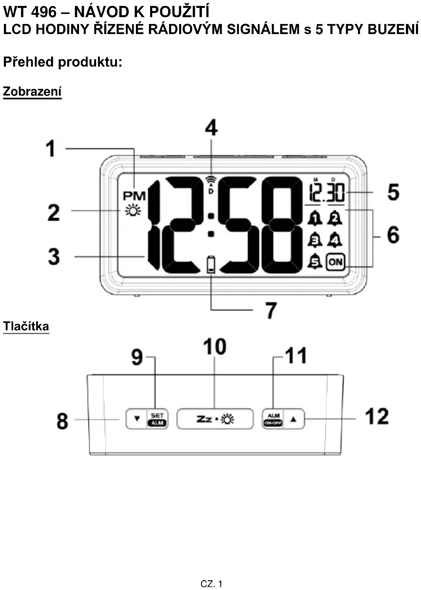 LCD HODINY ŘÍZENÉ RÁDIOVÝM SIGNÁLEM s 5 TYPY BUZENÍ Přehled produktu: Zobrazení