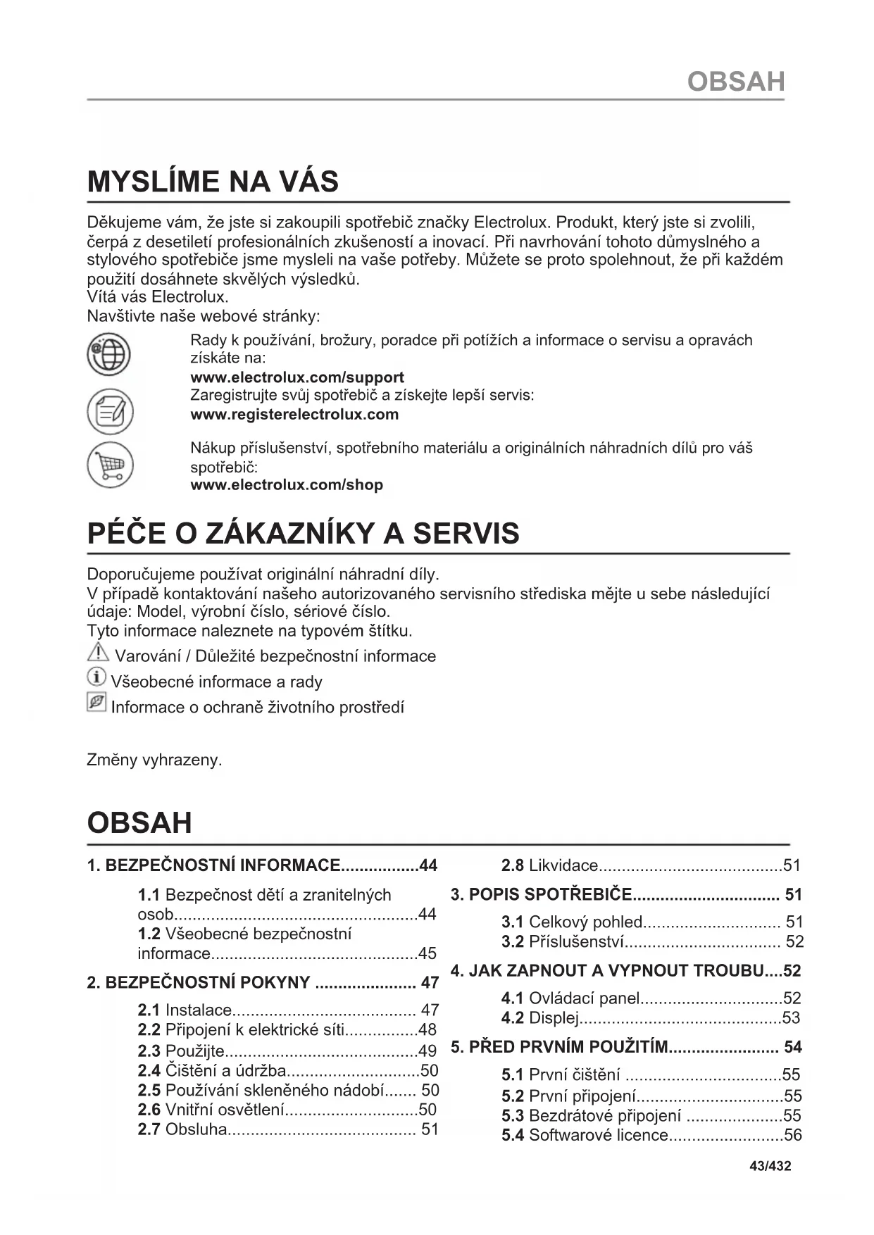 Děkujeme vám, že jste si zakoupili spotřebič značky Electrolux. Produkt, který jste si zvolili, čerpá z desetiletí profesionálních zkušeností a inovací. Při navrhování tohoto důmyslného a stylového spotřebiče jsme mysleli na vaše potřeby. Můžete se proto spolehnout, že při každém použití dosáhnete skvělých výsledků. Vítá vás Electrolux. Navštivte naše webové stránky: Rady k používání, brožury, poradce při potížích a informace o servisu a opravách získáte na: www.electrolux.com/support Zaregistrujte svůj spotřebič a získejte lepší servis: www.registerelectrolux.com Nákup příslušenství, spotřebního materiálu a originálních náhradních dílů pro váš spotřebič: www.electrolux.com/shop PÉČE O ZÁKAZNÍKY A SERVIS Doporučujeme používat originální náhradní díly. V případě kontaktování našeho autorizovaného servisního střediska mějte u sebe následující údaje: Model, výrobní číslo, sériové číslo. Tyto informace naleznete na typovém štítku. Varování / Důležité bezpečnostní informace Všeobecné informace a rady Informace o ochraně životního prostředí Zmĕny vyhrazeny. OBSAH