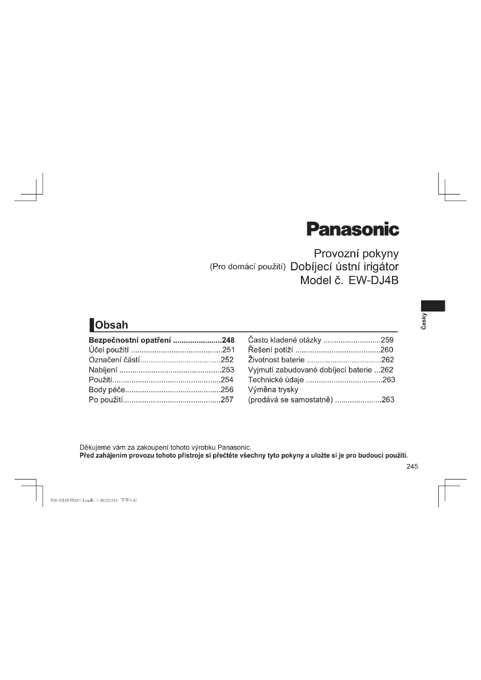 - EW-DJ4B EU0713.indb 21 2022/7/14 下午1:41244 EW-DJ4B EU0713.indb 22 2022/7/14 下午1:41245 Česky Děkujeme vám za zakoupení tohoto výrobku Panasonic.Před zahájením provozu tohoto přístroje si přečtěte všechny tyto pokyny a uložte si je pro budoucí použití. Obsah Provozní pokyny (Pro domácí použití) Dobíjecí ústní irigátor Model č. EW-DJ4B Bezpečnostní opatření p. 248