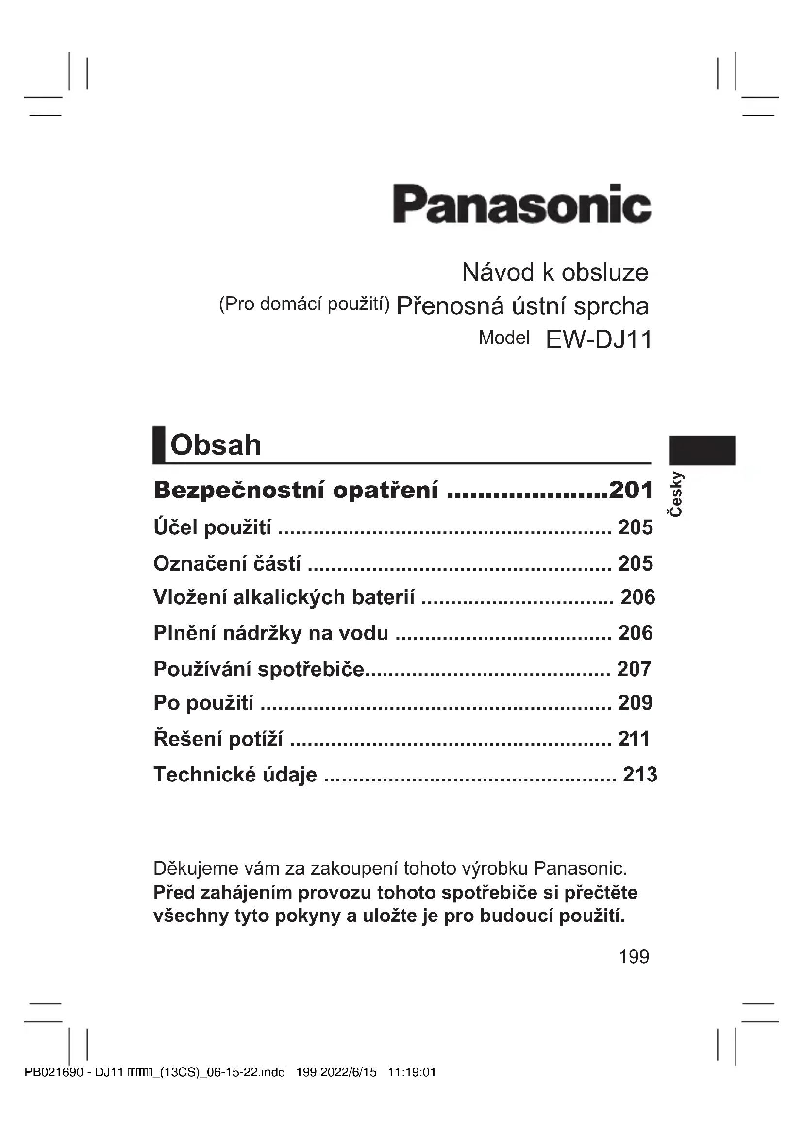 - Zastrčte PB021690 - DJ11 _(13CS)_06-15-22.indd 212 2022/6/15 11:19:04213 Česky Technické údaje Zdroj napájení Alkalická baterie Baterie Dvě LR6 (AA alkalické baterie) (prodávají se samostatně) Doba provozu Cca 20 minut (Když jsou použity dvě Panasonic LR6 (AA alkalické baterie), je tlak vody nastaven na úroveň 2, a okolní teplota je 20 °C) Objem nádržky Přibližně 150 mL (Na asi 35 sekund provozu při nastavené úrovni tlaku vody na 2) Rozměry Přibližně 30,9 cm (nebo 23,4 cm, není-li tryska nainstalovaná) (V) x 5,2 cm (Š) x 5,7 cm (H) Ve složeném stavu: Přibližně 15,4 cm (V) x 5,2 cm (Š) x 5,7 cm (H) Akustický hluk ve vzduchu 72 (dB (A) při 1 pW) Tento výrobek je určen pouze pro domácí použití. PB021690 - DJ11 _(13CS)_06-15-22.indd 213 2022/6/15 11:19:04214 Česky Likvidace použitých zařízení Jen pro státy Evropské unie a země s fungujícím systémem recyklace a zpracování odpadu. Tento symbol na výrobcích, jejich obalech a v doprovodné dokumentaci upozorňuje na to, že se použitá elektrická a elektronická zařízení, nesmějí likvidovat jako běžný komunální odpad. Aby byla zajištěna správná likvidace a recyklace použitých výrobků, odevzdávejte je v souladu s národní legislativou na příslušných sběrných místech. Správnou likvidací přispějete k úspoře cenných přírodních zdrojů a předejdete možným negativním dopadům na lidské zdraví a životní prostředí. O další podrobnosti o sběru a recyklaci odpadu požádejte místní úřady. Při nesprávné likvidaci tohoto druhu odpadu se vystavujete postihu podle národní legislativy. Dovozce: Panasonic Marketing Europe GmbH Oprávněný zástupce v EU: Panasonic Testing Centre Winsbergring 15, 22525 Hamburk, Německo Vyrobil: Panasonic Corporation 1006, Oaza Kadoma, Kadoma City, Osaka, Japonsko PB021690 - DJ11 _(13CS)_06-15-22.indd 214 2022/6/15 11:19:04215 Slovensky Ďakujeme, že ste si zakúpili výrobok značky Panasonic. Pred používaním tohto spotrebiča si prečítajte tento návod na obsluhu a uschovajte ho pre možnú potrebu v budúcnosti. Návod na obsluhu (Domáce použitie) Prenosná ústna sprcha Č. Modelu EW-DJ11 Obsah Bezpečnostné opatrenia p. 217