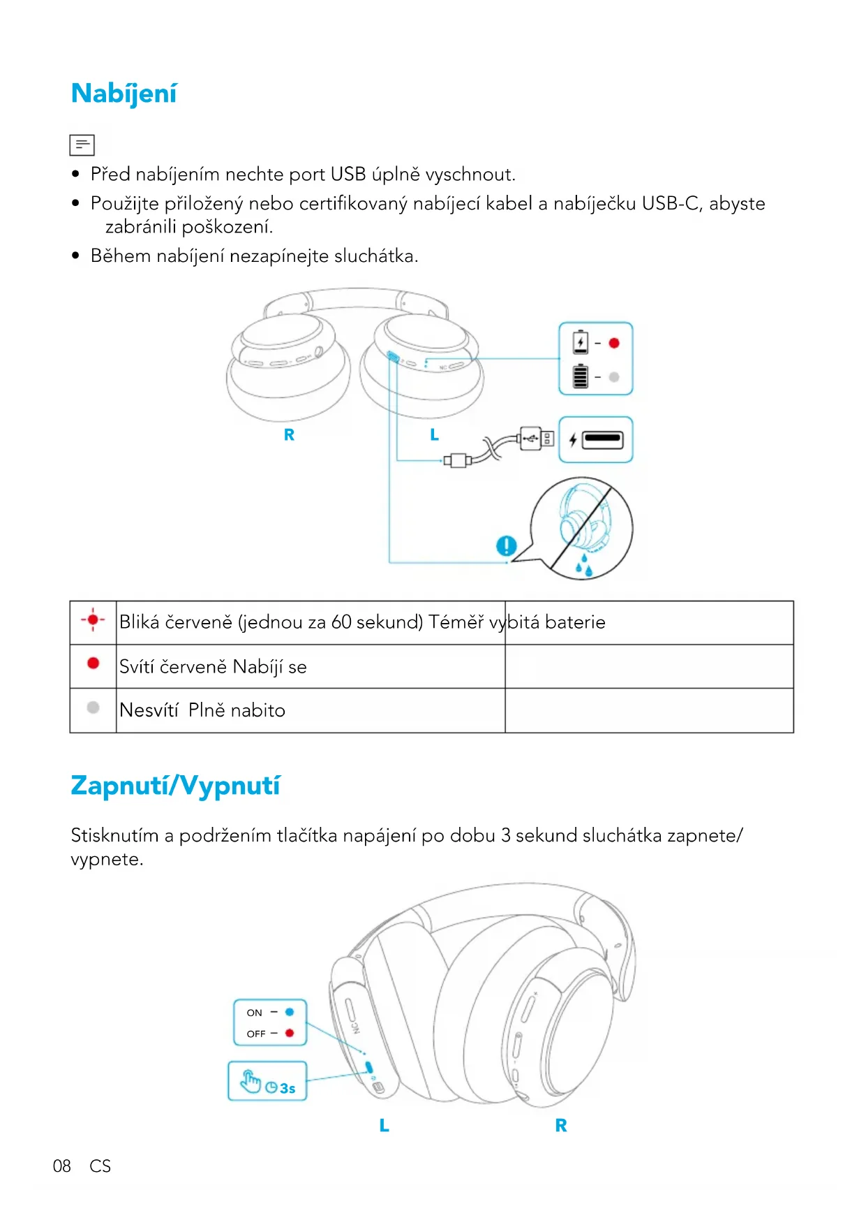 - Během nabíjení nezapínejte sluchátka. R L Bliká červeně (jednou za 60 sekund) Téměř vybitá baterie Svítí červeně Nabíjí se Nesvítí Plně nabito Zapnutí/Vypnutí Stisknutím a podržením tlačítka napájení po dobu 3 sekund sluchátka zapnete/ vypnete.