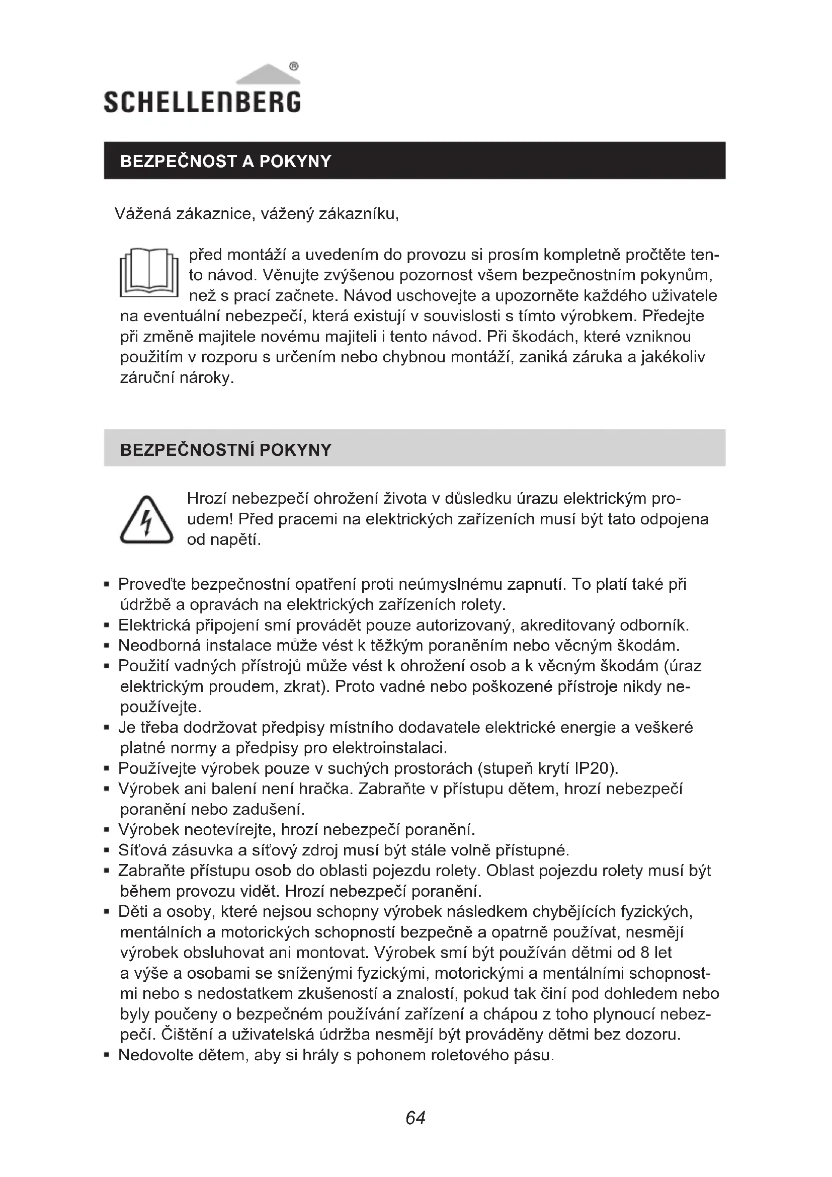 Hrozí nebezpečí ohrožení života v důsledku úrazu elektrickým pro- udem! Před pracemi na elektrických zařízeních musí být tato odpojena od napětí. Proveďte bezpečnostní opatření proti neúmyslnému zapnutí. To platí také při údržbě a opravách na elektrických zařízeních rolety. Elektrická připojení smí provádět pouze autorizovaný, akreditovaný odborník. Neodborná instalace může vést k těžkým poraněním nebo věcným škodám. Použití vadných přístrojů může vést k ohrožení osob a k věcným škodám (úraz elektrickým proudem, zkrat). Proto vadné nebo poškozené přístroje nikdy ne- používejte. Je třeba dodržovat předpisy místního dodavatele elektrické energie a veškeré platné normy a předpisy pro elektroinstalaci. Používejte výrobek pouze v suchých prostorách (stupeň krytí IP20). Výrobek ani balení není hračka. Zabraňte v přístupu dětem, hrozí nebezpečí poranění nebo zadušení. Výrobek neotevírejte, hrozí nebezpečí poranění. Síťová zásuvka a síťový zdroj musí být stále volně přístupné. Zabraňte přístupu osob do oblasti pojezdu rolety. Oblast pojezdu rolety musí být během provozu vidět. Hrozí nebezpečí poranění. Děti a osoby, které nejsou schopny výrobek následkem chybějících fyzických, mentálních a motorických schopností bezpečně a opatrně používat, nesmějí výrobek obsluhovat ani montovat. Výrobek smí být používán dětmi od 8 let a výše a osobami se sníženými fyzickými, motorickými a mentálními schopnost- mi nebo s nedostatkem zkušeností a znalostí, pokud tak činí pod dohledem nebo byly poučeny o bezpečném používání zařízení a chápou z toho plynoucí nebez- pečí. Čištění a uživatelská údržba nesmějí být prováděny dětmi bez dozoru. Nedovolte dětem, aby si hrály s pohonem roletového pásu.6564