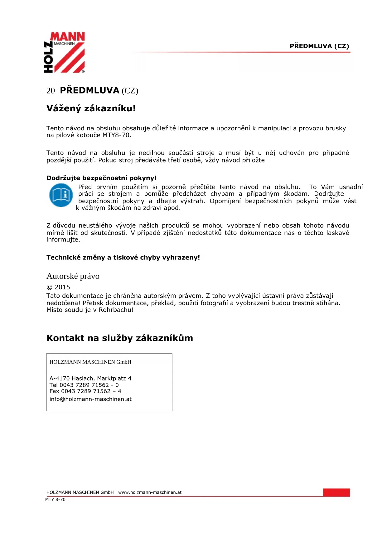 La machine á besoin de peu entretien et ne contient que peu de pièces, qui doivent être soumis à un opérateur de maintenance. Fautes ou défauts qui peuvent affecter la sécurité de la machine, doit être éliminé immédiatement. Activités de réparation peut être effectuée par du personnel qualifié! Le nettoyage complet assure une longue vie de la machine et est une dar exigence de sécurité. Le nettoyage complet assure une longue vie de la machine et est une dar exigence de sécurité. Apres chaque journée de travail la machine et tous ses parties doivent être nettoyées а fond. Vérifiez régulièrement que tous les avertissements et les instructions sont disponibles sur la machine et lisible. La machine ne peut pas être stockée dans un lieu humide et doivent être protégés contre les intempéries.PŘEDMLUVA (CZ) HOLZMANN MASCHINEN GmbH www.holzmann-maschinen.at 33 MTY 8-70 20 PŘEDMLUVA (CZ) Vážený zákazníku! Tento návod na obsluhu obsahuje důležité informace a upozornění k manipulaci a provozu brusky na pilové kotouče MTY8-70. Tento návod na obsluhu je nedílnou součástí stroje a musí být u něj uchován pro případné pozdější použití. Pokud stroj předáváte třetí osobě, vždy návod přiložte! Dodržujte bezpečnostní pokyny! Před prvním použitím si pozorně přečtěte tento návod na obsluhu. To Vám usnadní práci se strojem a pomůže předcházet chybám a případným škodám. Dodržujte bezpečnostní pokyny a dbejte výstrah. Opomíjení bezpečnostních pokynů může vést k vážným škodám na zdraví apod. Z důvodu neustálého vývoje našich produktů se mohou vyobrazení nebo obsah tohoto návodu mírně lišit od skutečnosti. V případě zjištění nedostatků této dokumentace nás o těchto laskavě informujte. Technické změny a tiskové chyby vyhrazeny! Autorské právo © 2015 Tato dokumentace je chráněna autorským právem. Z toho vyplývající ústavní práva zůstávají nedotčena! Přetisk dokumentace, překlad, použití fotografií a vyobrazení budou trestně stíhána. Místo soudu je v Rohrbachu!