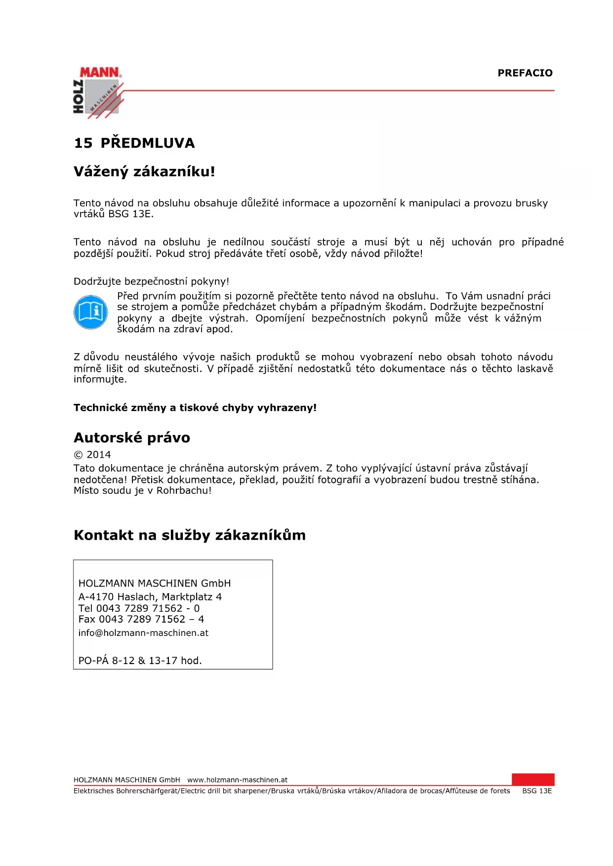 Po uplynuti zaručni doby mohou byt opravy realizovány i u neautorizovanych servisnich firem. K dispozici je Vám samozřejme i nadále servis společnosti HOLZMANN-Maschinen GmbH. V takovém pripadě uplatnéte Vase nezávizné poptávky/reklamace s udaji dlé bodu C) na nás zákaznický servis nebo nám poslete vyplnény priloženy servisní formulář.