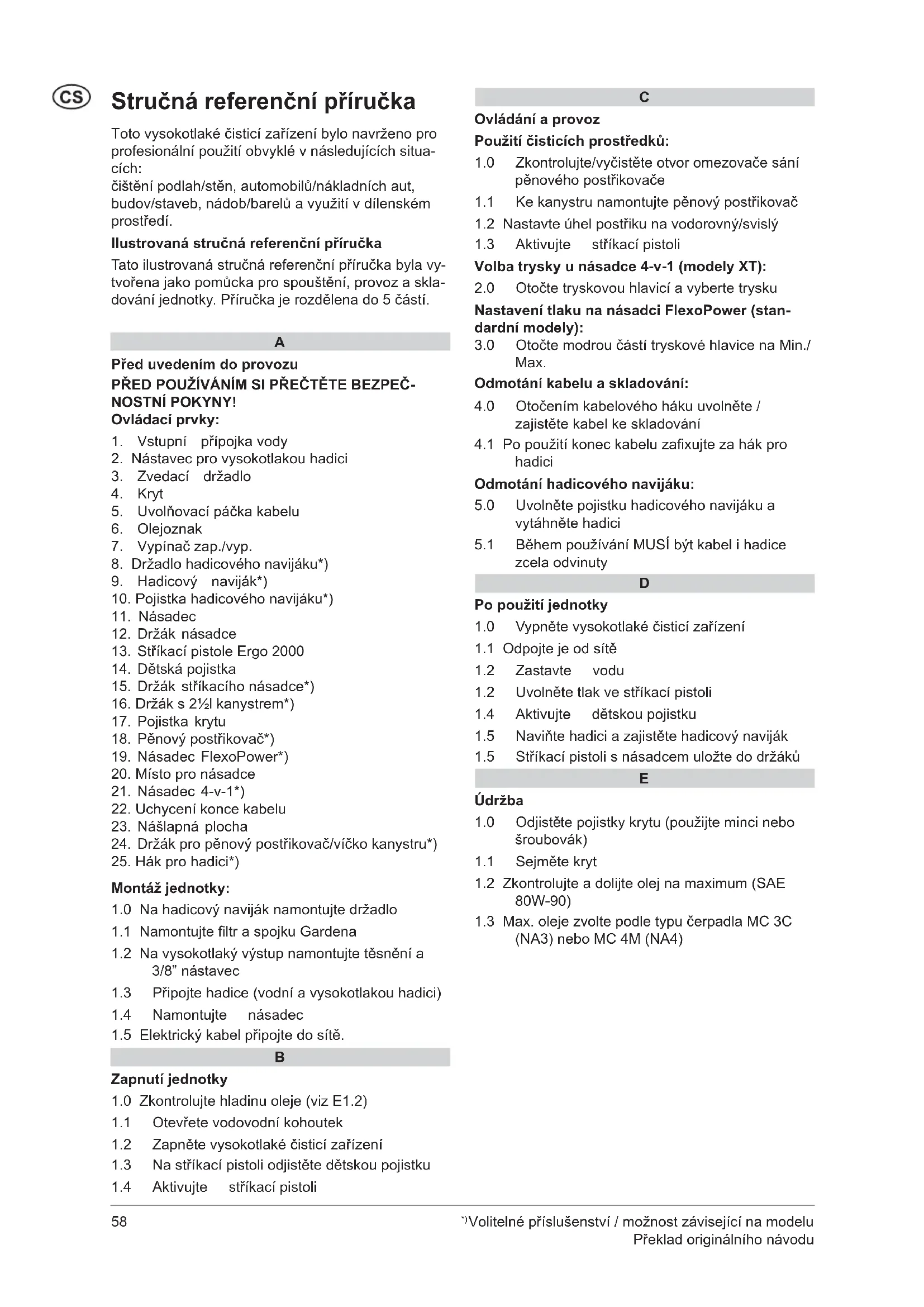 Stručná referenční příručka Toto vysokotlaké čisticí zařízení bylo navrženo pro profesionální použití obvyklé v následujících situa- cích: čištění podlah/stěn, automobilů/nákladních aut, budov/staveb, nádob/barelů a využití v dílenském prostředí. Ilustrovaná stručná referenční příručka Tato ilustrovaná stručná referenční příručka byla vy- tvořena jako pomůcka pro spouštění, provoz a skla- dování jednotky. Příručka je rozdělena do 5 částí.