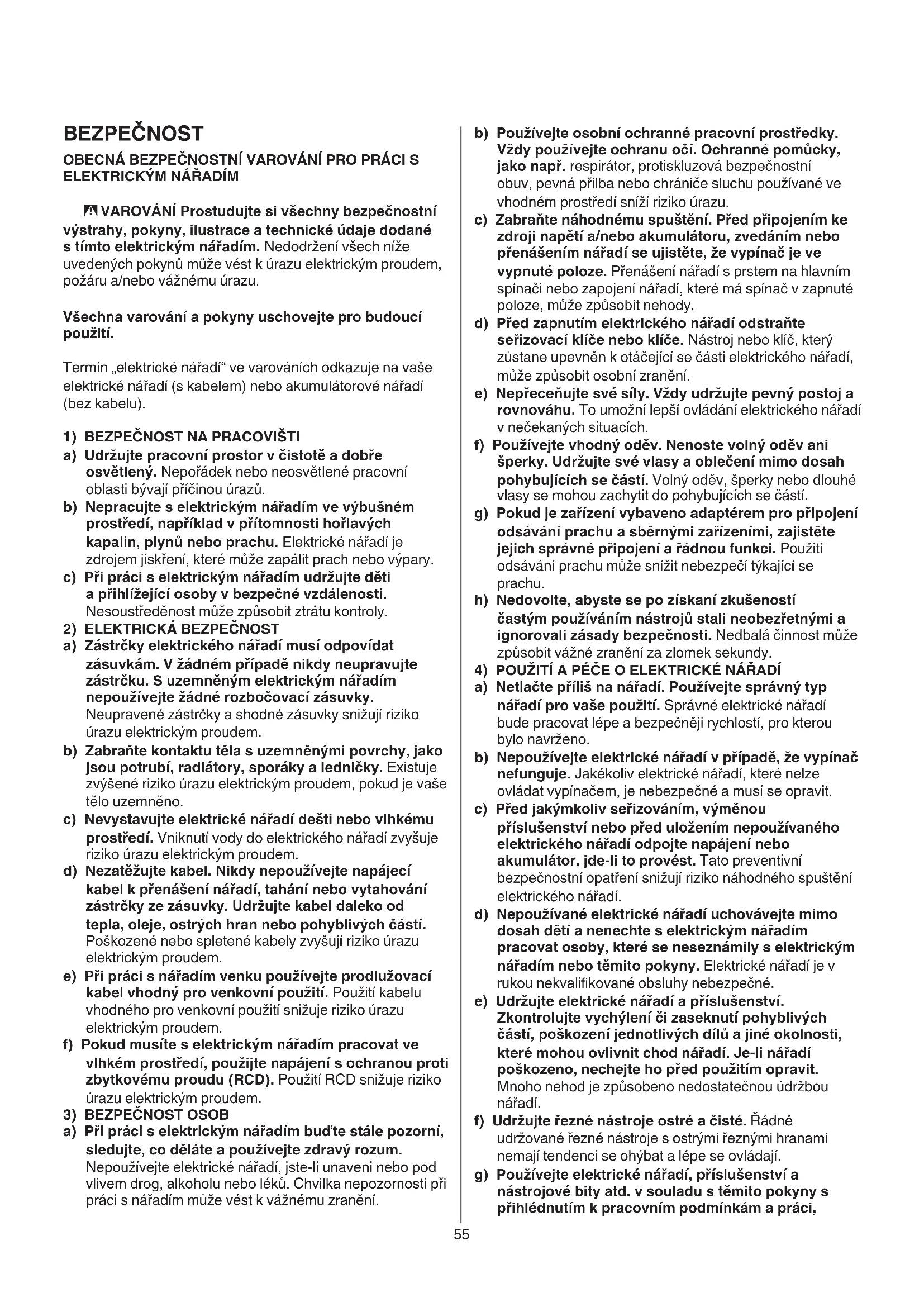 - VAROVÁNÍ Prostudujte si všechny bezpečnostní výstrahy, pokyny, ilustrace a technické údaje dodané s tímto elektrickým nářadím. Nedodržení všech níže uvedených pokynů může vést k úrazu elektrickým proudem, požáru a/nebo vážnému úrazu. Všechna varování a pokyny uschovejte pro budoucí použití. Termín „elektrické nářadí“ ve varováních odkazuje na vaše elektrické nářadí (s kabelem) nebo akumulátorové nářadí (bez kabelu).