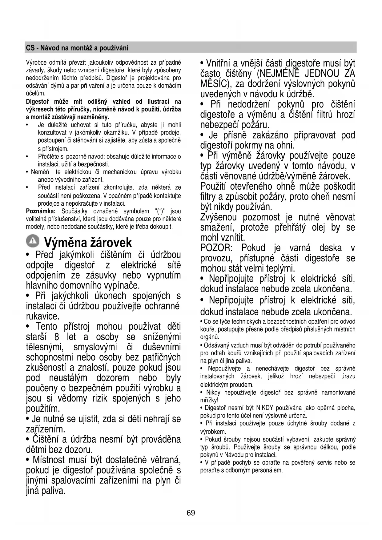 - Při výměně žárovky používejte pouze typ žárovky uvedený v tomto návodu, v části věnované údržbě/výměně žárovek. Použití otevřeného ohně může poškodit filtry a způsobit požáry, proto oheň nesmí být nikdy používán. Zvýšenou pozornost je nutné věnovat smažení, protože přehřátý olej by se mohl vznítit. POZOR: Pokud je varná deska v provozu, přístupné části digestoře se mohou stát velmi teplými.