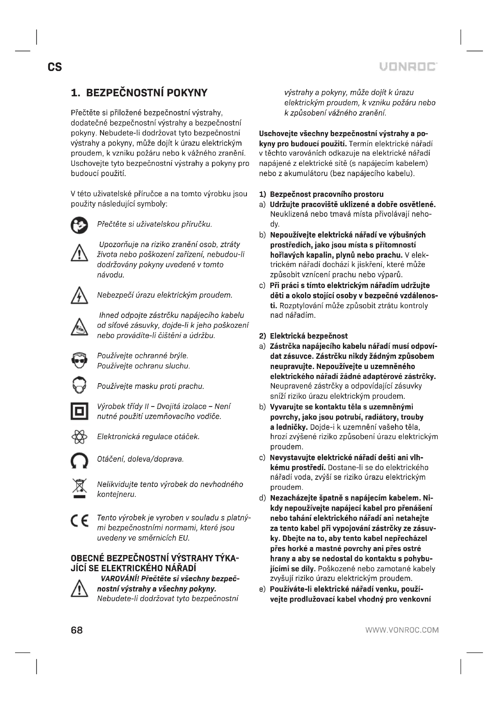 Přečtěte si přiložené bezpečnostní výstrahy, dodatečné bezpečnostní výstrahy abezpečnostní pokyny. Nebudete-li dodržovat tyto bezpečnostní výstrahy apokyny, může dojít kúrazu elektrickým proudem, kvzniku požáru nebo kvážného zranění. Uschovejte tyto bezpečnostní výstrahy apokyny pro budoucí použití. Vtéto uživatelské příručce ana tomto výrobku jsou použity následující symboly: Přečtěte si uživatelskou příručku. Upozorňuje na riziko zranění osob, ztráty života nebo poškození zařízení, nebudou-li dodržovány pokyny uvedené vtomto návodu. Nebezpečí úrazu elektrickým proudem. Ihned odpojte zástrčku napájecího kabelu od síťové zásuvky, dojde-li kjeho poškození nebo provádíte-li čištění aúdržbu. Používejte ochranné brýle. Používejte ochranu sluchu. Používejte masku proti prachu. Výrobek třídy II – Dvojitá izolace – Není nutné použití uzemňovacího vodiče. Elektronická regulace otáček. Otáčení, doleva/doprava. Nelikvidujte tento výrobek do nevhodného kontejneru. Tento výrobek je vyroben vsouladu splatný- mi bezpečnostními normami, které jsou uvedeny ve směrnicích EU. OBECNÉ BEZPEČNOSTNÍ VÝSTRAHY TÝKA JÍCÍ SE ELEKTRICKÉHO NÁŘADÍ VAROVÁNÍ! Přečtěte si všechny bezpeč- nostní výstrahy avšechny pokyny. Nebudete-li dodržovat tyto bezpečnostní výstrahy apokyny, může dojít kúrazu elektrickým proudem, kvzniku požáru nebo kzpůsobení vážného zranění. Uschovejte všechny bezpečnostní výstrahy apo