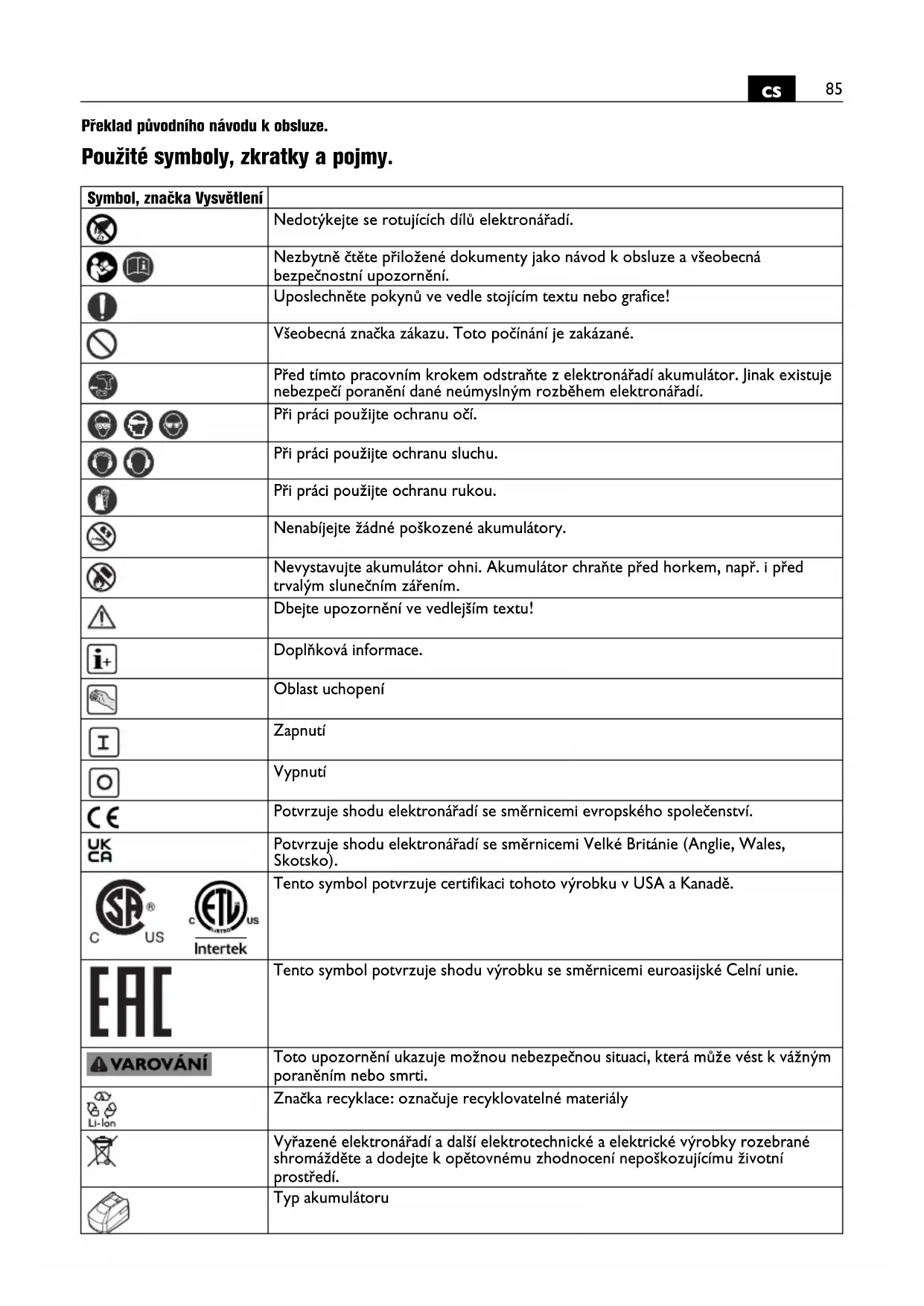 Překlad původního návodu k obsluze. Použité symboly, zkratky a pojmy. Symbol, značka Vysvětlení Nedotýkejte se rotujících dílů elektronářadí. Nezbytně čtěte přiložené dokumenty jako návod k obsluze a všeobecná bezpečnostní upozornění. Uposlechněte pokynů ve vedle stojícím textu nebo grafice! Všeobecná značka zákazu. Toto počínání je zakázané. Před tímto pracovním krokem odstraňte z elektronářadí akumulátor. Jinak existuje nebezpečí poranění dané neúmyslným rozběhem elektronářadí. Při práci použijte ochranu očí. Při práci použijte ochranu sluchu. Při práci použijte ochranu rukou. Nenabíjejte žádné poškozené akumulátory. Nevystavujte akumulátor ohni. Akumulátor chraňte před horkem, např. i před trvalým slunečním zářením. Dbejte upozornění ve vedlejším textu! Doplňková informace. Oblast uchopení Zapnutí Vypnutí Potvrzuje shodu elektronářadí se směrnicemi evropského společenství. Potvrzuje shodu elektronářadí se směrnicemi Velké Británie (Anglie, Wales, Skotsko). Tento symbol potvrzuje certifikaci tohoto výrobku v USA a Kanadě. Tento symbol potvrzuje shodu výrobku se směrnicemi euroasijské Celní unie. Toto upozornění ukazuje možnou nebezpečnou situaci, která může vést k vážným poraněním nebo smrti. Značka recyklace: označuje recyklovatelné materiály Vyřazené elektronářadí a další elektrotechnické a elektrické výrobky rozebrané shromážděte a dodejte k opětovnému zhodnocení nepoškozujícímu životní prostředí. Typ akumulátoru86