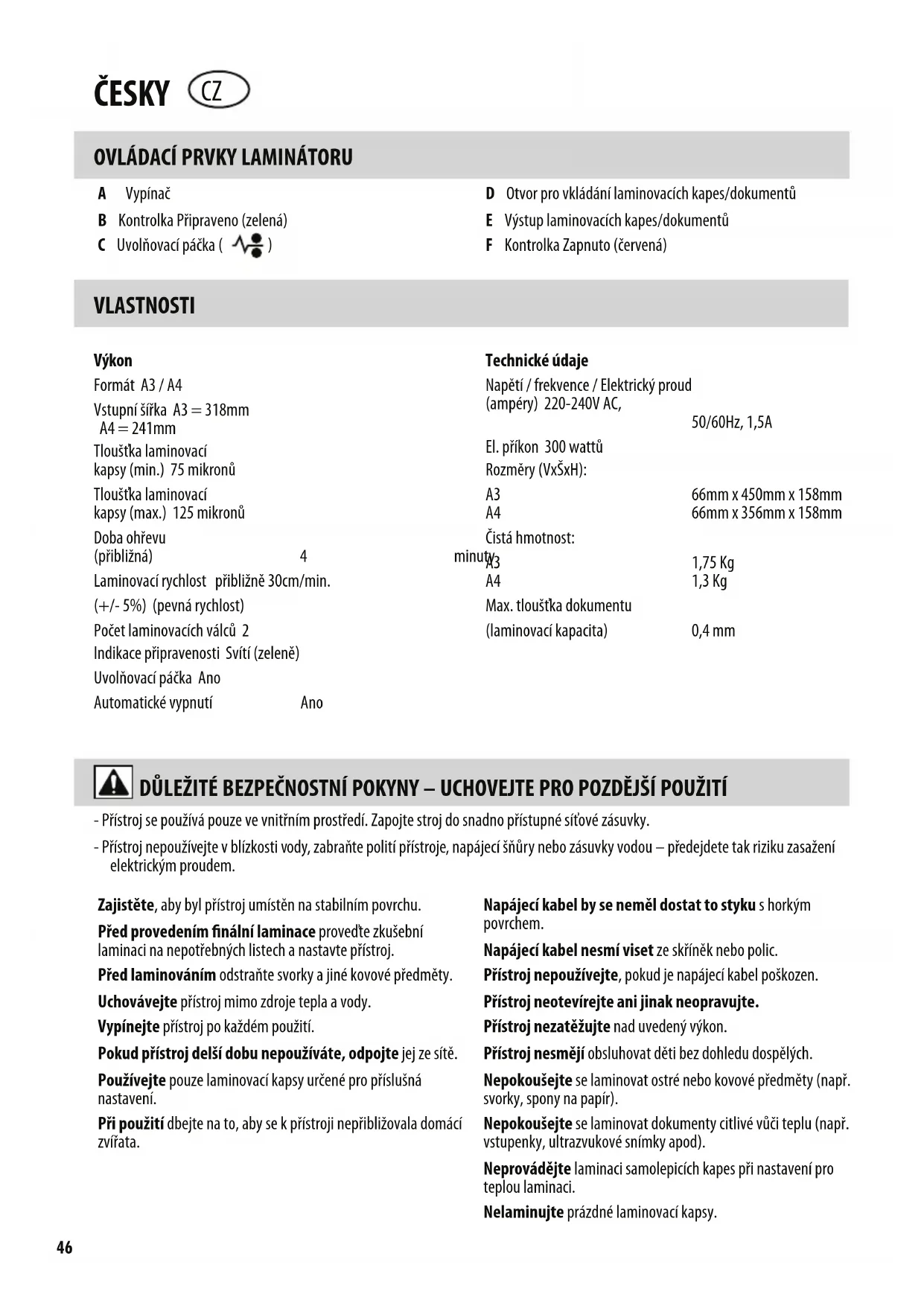 D Otvor pro vkládání laminovacích kapes/dokumentů E Výstup laminovacích kapes/dokumentů F Kontrolka Zapnuto (červená) VLASTNOSTI - Přístroj se používá pouze ve vnitřním prostředí. Zapojte stroj do snadno přístupné síťové zásuvky. - Přístroj nepoužívejte v blízkosti vody, zabraňte polití přístroje, napájecí šňůry nebo zásuvky vodou – předejdete tak riziku zasažení elektrickým proudem. ČESKY