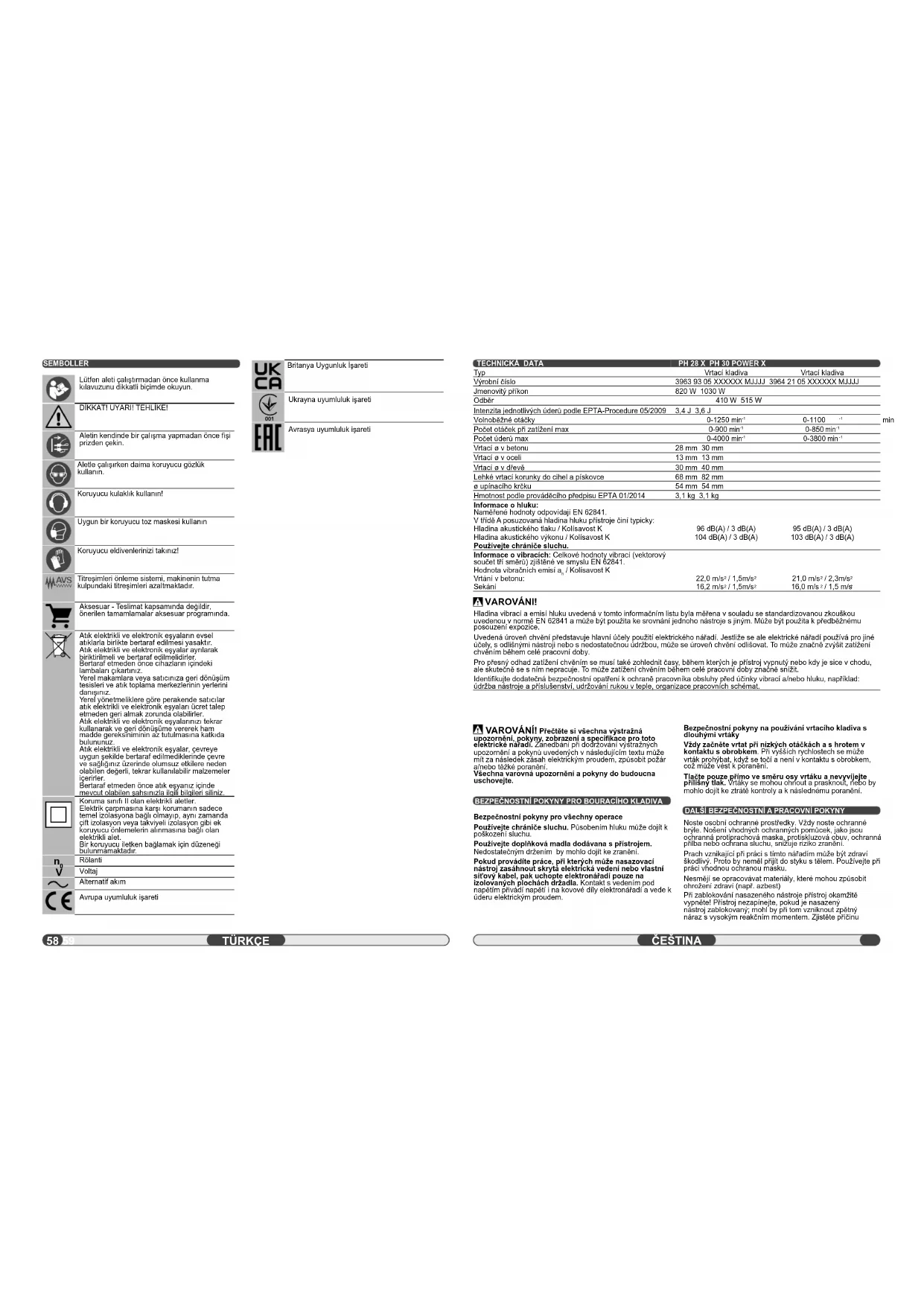 Noste osobní ochranné prostředky. Vždy noste ochranné brýle. Nošení vhodných ochranných pomůcek, jako jsou ochranná protiprachová maska, protiskluzová obuv, ochranná přilba nebo ochrana sluchu, snižuje riziko zranění. Prach vznikající při práci s tímto nářadím může být zdraví škodlivý. Proto by neměl přijít do styku s tělem. Používejte při práci vhodnou ochranou masku. Nesmějí se opracovávat materiály, které mohou způsobit ohrožení zdraví (např. azbest) Při zablokování nasazeného nástroje přístroj okamžitě vypněte! Přístroj nezapínejte, pokud je nasazený nástroj zablokovaný; mohl by při tom vzniknout zpětný náraz s vysokým reakčním momentem. Zjistěte příčinu VAROVÁNI! Hladina vibrací a emisí hluku uvedená v tomto informačním listu byla měřena v souladu se standardizovanou zkouškou uvedenou v normě EN 62841 a může být použita ke srovnání jednoho nástroje s jiným. Může být použita k předběžnému posouzení expozice. Uvedená úroveň chvění představuje hlavní účely použití elektrického nářadí. Jestliže se ale elektrické nářadí používá pro jiné účely, s odlišnými nástroji nebo s nedostatečnou údržbou, může se úroveň chvění odlišovat. To může značně zvýšit zatížení chvěním během celé pracovní doby. Pro přesný odhad zatížení chvěním se musí také zohlednit časy, během kterých je přístroj vypnutý nebo kdy je sice v chodu, ale skutečně se s ním nepracuje. To může zatížení chvěním během celé pracovní doby značně snížit. Identifi kujte dodatečná bezpečnostní opatření k ochraně pracovníka obsluhy před účinky vibrací a/nebo hluku, například: údržba nástroje a příslušenství, udržování rukou v teple, organizace pracovních schémat. SEMBOLLER Lütfen aleti çalıştırmadan önce kullanma kılavuzunu dikkatli biçimde okuyun. DİKKAT! UYARI! TEHLİKE! Aletin kendinde bir çalışma yapmadan önce fi şi prizden çekin. Aletle çalışırken daima koruyucu gözlük kullanın. Koruyucu kulaklık kullanın! Uygun bir koruyucu toz maskesi kullanın Koruyucu eldivenlerinizi takınız! Titreşimleri önleme sistemi, makinenin tutma kulpundaki titreşimleri azaltmaktadır. Aksesuar - Teslimat kapsamında değildir, önerilen tamamlamalar aksesuar programında. Atık elektrikli ve elektronik eşyaların evsel atıklarla birlikte bertaraf edilmesi yasaktır. Atık elektrikli ve elektronik eşyalar ayrılarak biriktirilmeli ve bertaraf edilmelidirler. Bertaraf etmeden önce cihazların içindeki lambaları çıkartınız. Yerel makamlara veya satıcınıza geri dönüşüm tesisleri ve atık toplama merkezlerinin yerlerini danışınız. Yerel yönetmeliklere göre perakende satıcılar atık elektrikli ve elektronik eşyaları ücret talep etmeden geri almak zorunda olabilirler. Atık elektrikli ve elektronik eşyalarınızı tekrar kullanarak ve geri dönüşüme vererek ham madde gereksiniminin az tutulmasına katkıda bulununuz. Atık elektrikli ve elektronik eşyalar, çevreye uygun şekilde bertaraf edilmediklerinde çevre ve sağlığınız üzerinde olumsuz etkilere neden olabilen değerli, tekrar kullan ılabilir malzemeler içerirler. Bertaraf etmeden önce atık eşyanız içinde mevcut olabilen şahsınızla ilgili bilgileri siliniz. Koruma sınıfı II olan elektrikli aletler. Elektrik çarpmasına karşı korumanın sadece temel izolasyona bağlı olmayıp, aynı zamanda çift izolasyon veya takviyeli izolasyon gibi ek koruyucu önlemelerin alınmasına bağlı olan elektrikli alet. Bir koruyucu iletken bağlamak için düzeneği bulunmamaktadır.