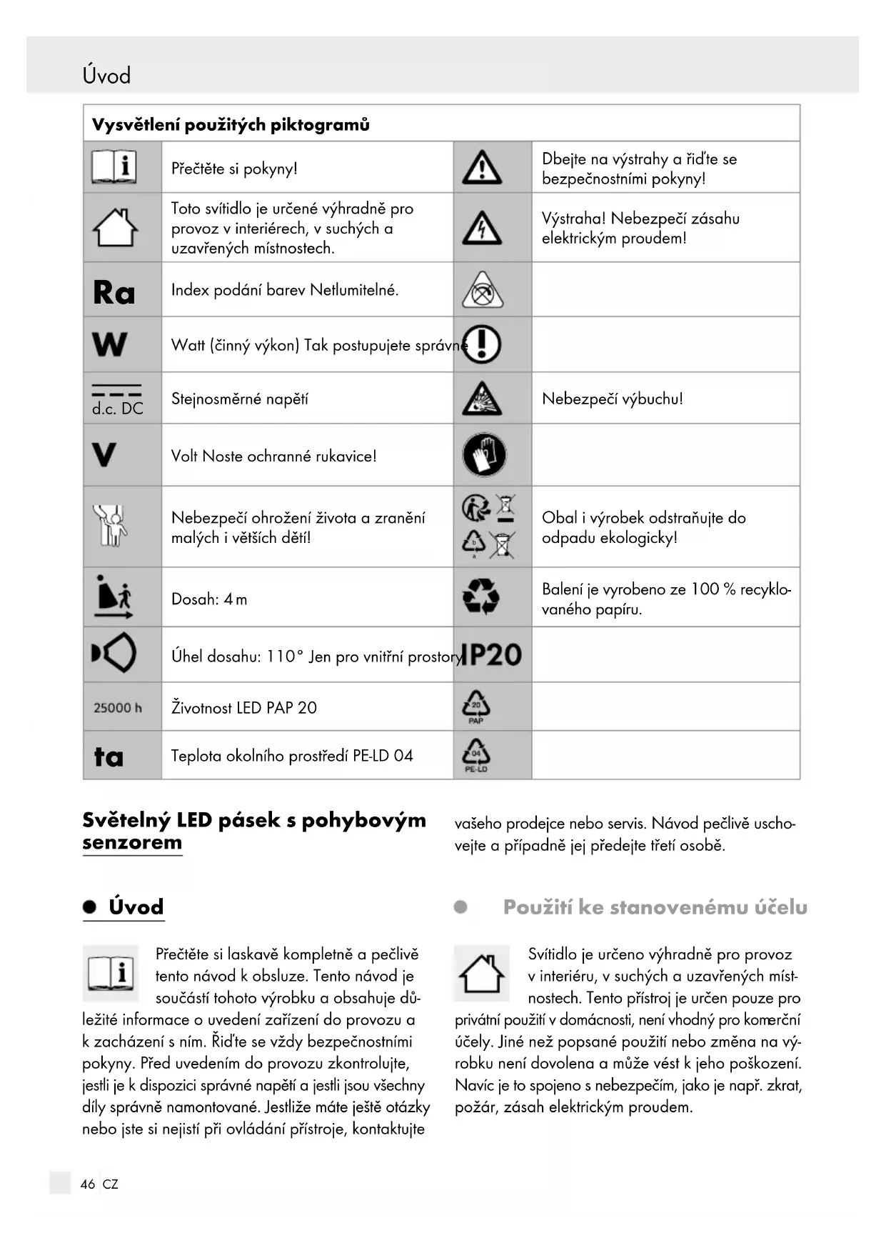Obal i výrobek odstraňujte do odpadu ekologicky! Dosah: 4 m Balení je vyrobeno ze 100 % recyklo- vaného papíru. Úhel dosahu: 110° Jen pro vnitřní prostory Životnost LED PAP 20