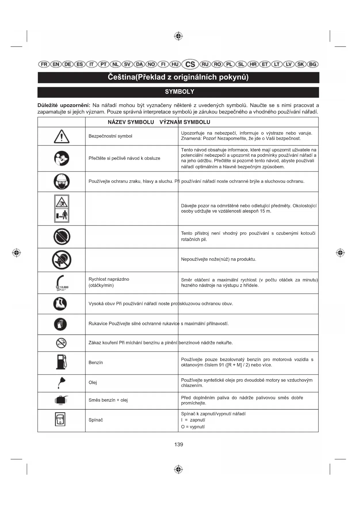 c. részben leírt utasításoknak megfelelően.139 Čeština(Překlad z originálních pokynů) SYMBOLY Důležité upozornění: Na nářadí mohou být vyznačeny některé z uvedených symbolů. Naučte se s nimi pracovat a zapamatujte si jejich význam. Pouze správná interpretace symbolů je zárukou bezpečného a vhodného používání nářadí. 1É=(96<0%2/8 9ë=1$06<0%2/8 Bezpečnostní symbol Upozorňuje na nebezpečí, informuje o výstraze nebo varuje. Znamená: Pozor! Nezapomeňte, že jde o Vaši bezpečnost. Přečtěte si pečlivě návod k obsluze Tento návod obsahuje informace, které mají upozornit uživatele na potenciální nebezpečí a upozornit na podmínky používání nářadí a na jeho údržbu. Přečtěte si pozorně tento návod, abyste používali nářadí optimálním a hlavně bezpečným způsobem. Používejte ochranu zraku, hlavy a sluchu. Při používání nářadí noste ochranné brýle a sluchovou ochranu. Dávejte pozor na odmrštěné nebo odletující předměty. Okolostojící osoby udržujte ve vzdálenosti alespoň 15 m. Tento přístroj není vhodný pro používání s ozubenými kotouči rotačních pil. Nepoužívejte nože(nůž) na produktu. Rychlost naprázdno (otáčky/min) Směr otáčení a maximální rychlost (v počtu otáček za minutu) řezného nástroje na výstupu z hřídele. Vysoká obuv Při používání nářadí noste protiskluzovou ochranou obuv. Rukavice Používejte silné ochranné rukavice s maximální přilnavostí. Zákaz kouření Při míchání benzínu a plnění benzínové nádrže nekuřte. Benzín Používejte pouze bezolovnatý benzín pro motorová vozidla s oktanovým číslem 91 ([R + M] / 2) nebo více. Olej Používejte syntetické oleje pro dvoudobé motory se vzduchovým chlazením. Směs benzín + olej Před doplněním paliva do nádrže palivovou směs dobře promíchejte. Spínač Spínač k zapnutí/vypnutí nářadí I = zapnutí O = vypnutí140 Čeština(Překlad z originálních pokynů) Pracovní poloha Nastavte páku sytiče do polohy „FULL“. Nastavte páku sytiče do polohy „HALF“. Nastavte spínač zapalování do polohy “I” (Zap.). Stiskněte 10-krát hlavičku startéru. Stiskněte startovací rukojeť pro nastartování motoru. Stiskněte zámek spouště a spoušť plynu pro chod. Čekací doba 10 sekund Motor nářadí se vypíná nastavením vypínače do polohy “O”, tj. do polohy “VYPNUTO”. Motor nářadí se vypíná nastavením vypínače do polohy “O”, tj. do polohy “VYPNUTO”. Toto nářadí je v souladu se všemi normami a předpisy platnými v zemi EU, ve které bylo zakoupeno. Euroasijská značka shody Ukrajinská značka shody Následující signální slova a významy jsou vhodné pro vysvětlení úrovní nebezpečí spojených s tímto výrobkem.