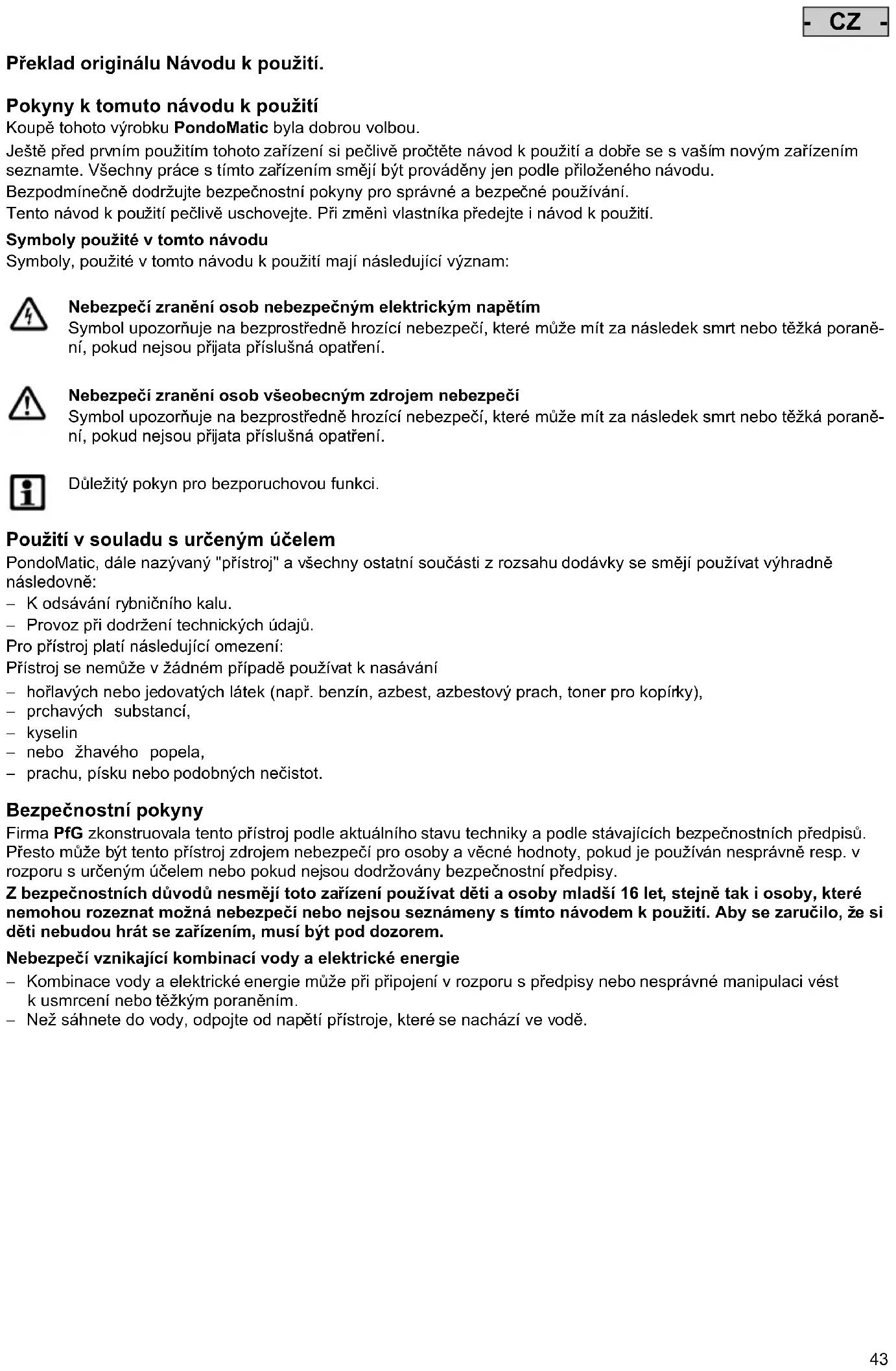 Firma PfG zkonstruovala tento pristroj podle aktualiho stavu techniky a podle stavajicich bezpecnostnich predpisu. Presto mze byt tento pristroj zdrojem nebezpeci pro osoby a vecné hodnoty,Pokud je pouzivan nespravné resp. v Rozporu s urcenym ucelem nebo pokud nejsou dorzovany bezpecnostni predpisy.